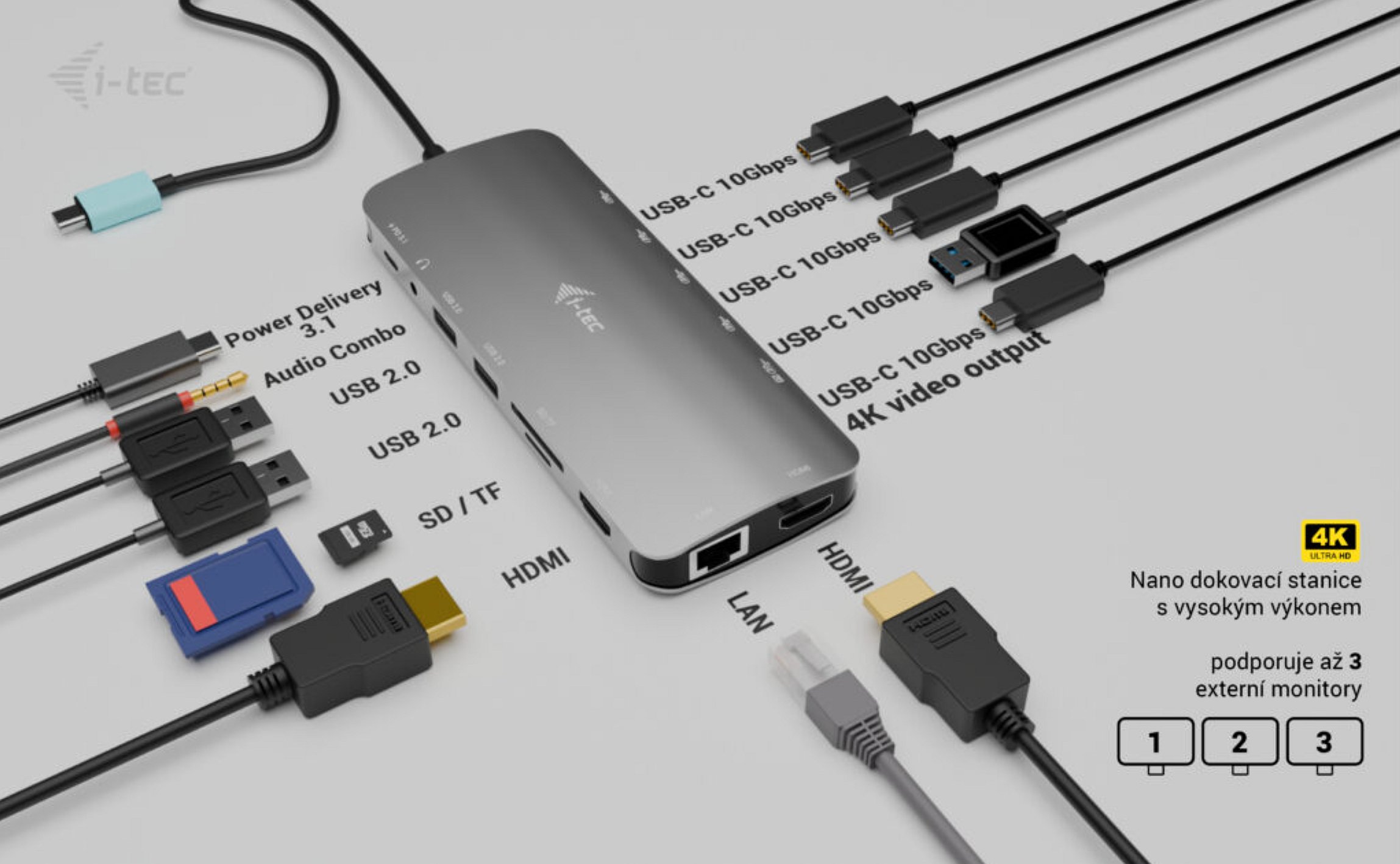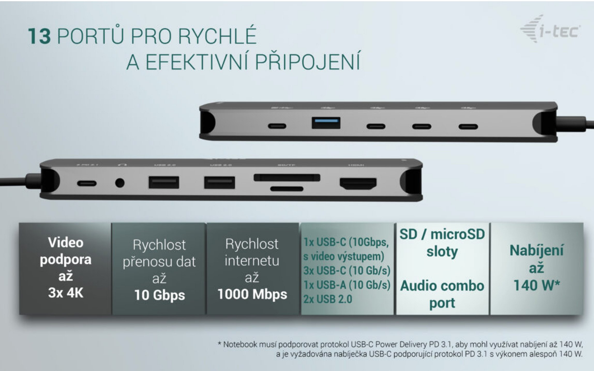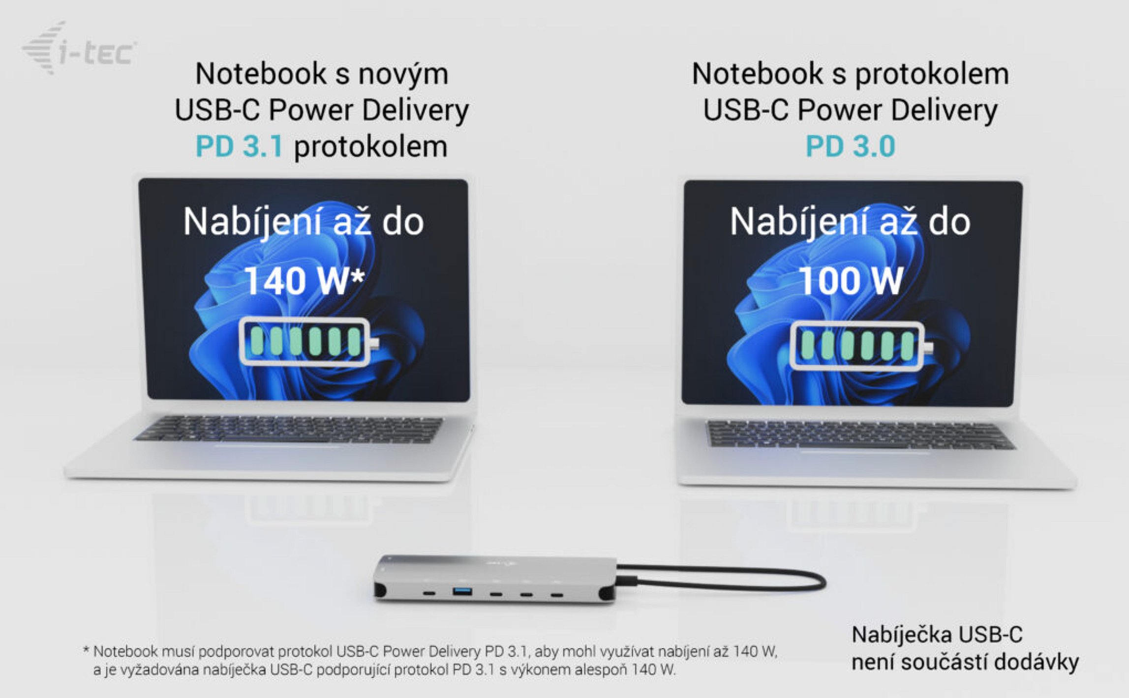 • * Pokud váš notebook nebo tablet podporuje nový a moderní nabíjecí protokol USB-C Power Delivery PD 3.1, dokovací stanice nabídne nabíjecí výkon až 130 W (pokud máte PD 3.0, nabíjecí výkon bude až 100 W).