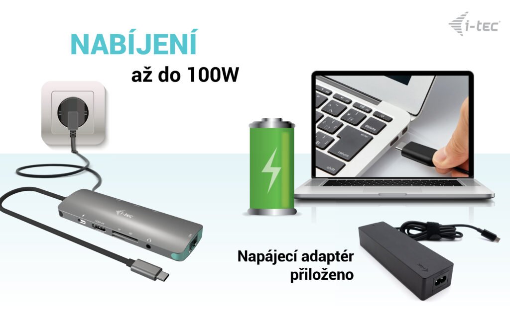 K dokovací stanici je rovněž přiložen napájecí adaptér USB-C o celkovém výkonu 100 W (USB-C port: 100 W)