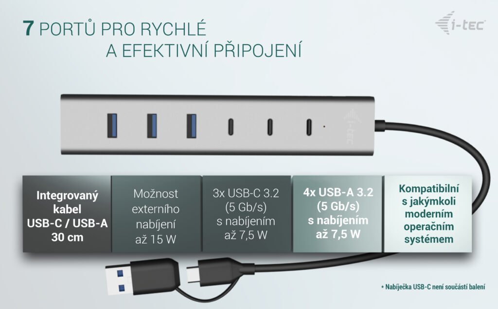 • Nabíjecí HUB USB-A/USB-C, až pro 7 zařízení