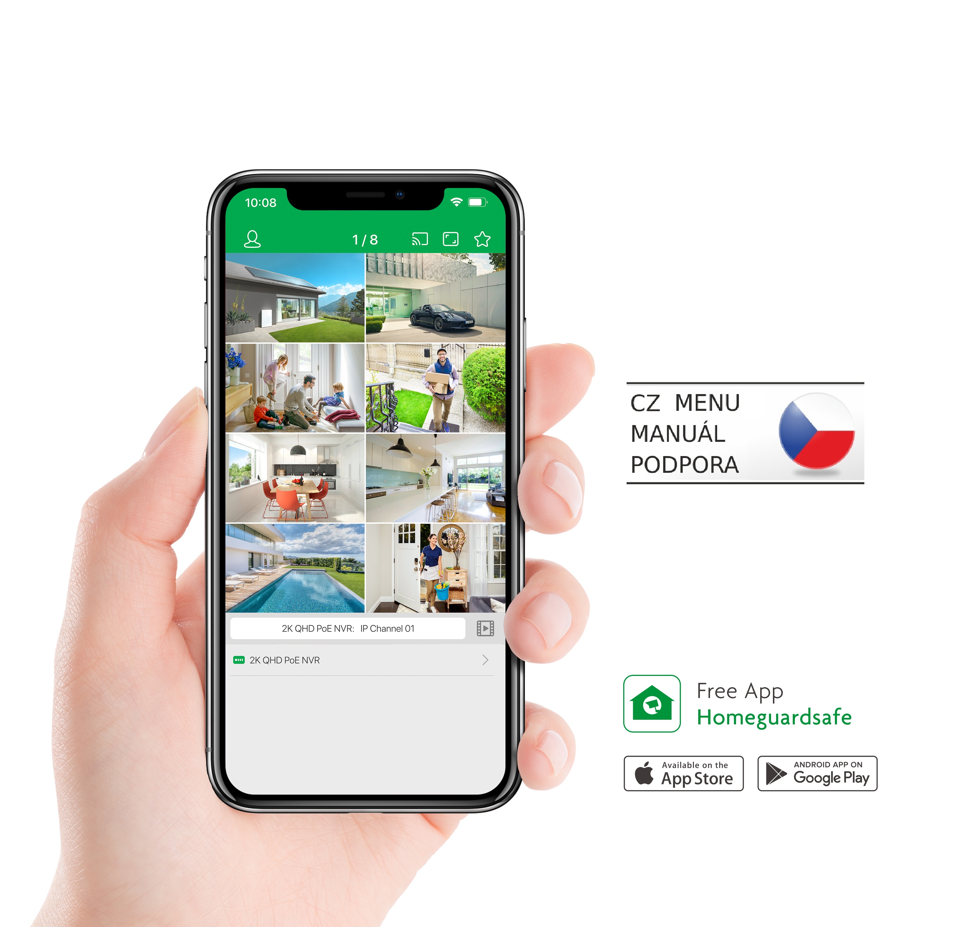 - Aplikace: zdarma aplikace "Homeguardsafe" pro snadný přístup z vašeho smartphonu/tabletu s podporou Android a iOS z celého světa v češtině,