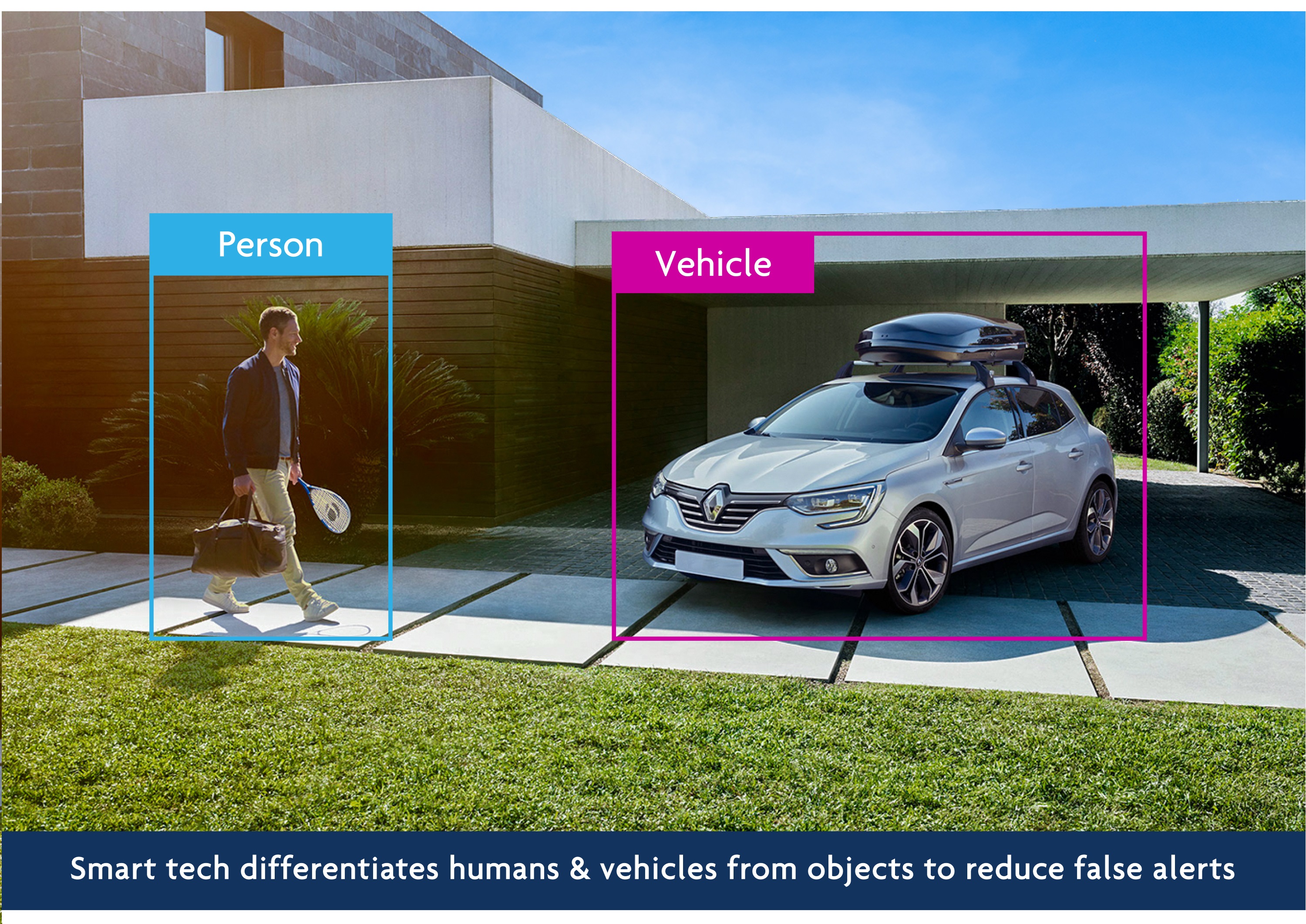 - SMART detekce pohybu: speciální detekce pohybu je přesnější než samotná detekce optikou, a rozeznává osoby a vozidla,