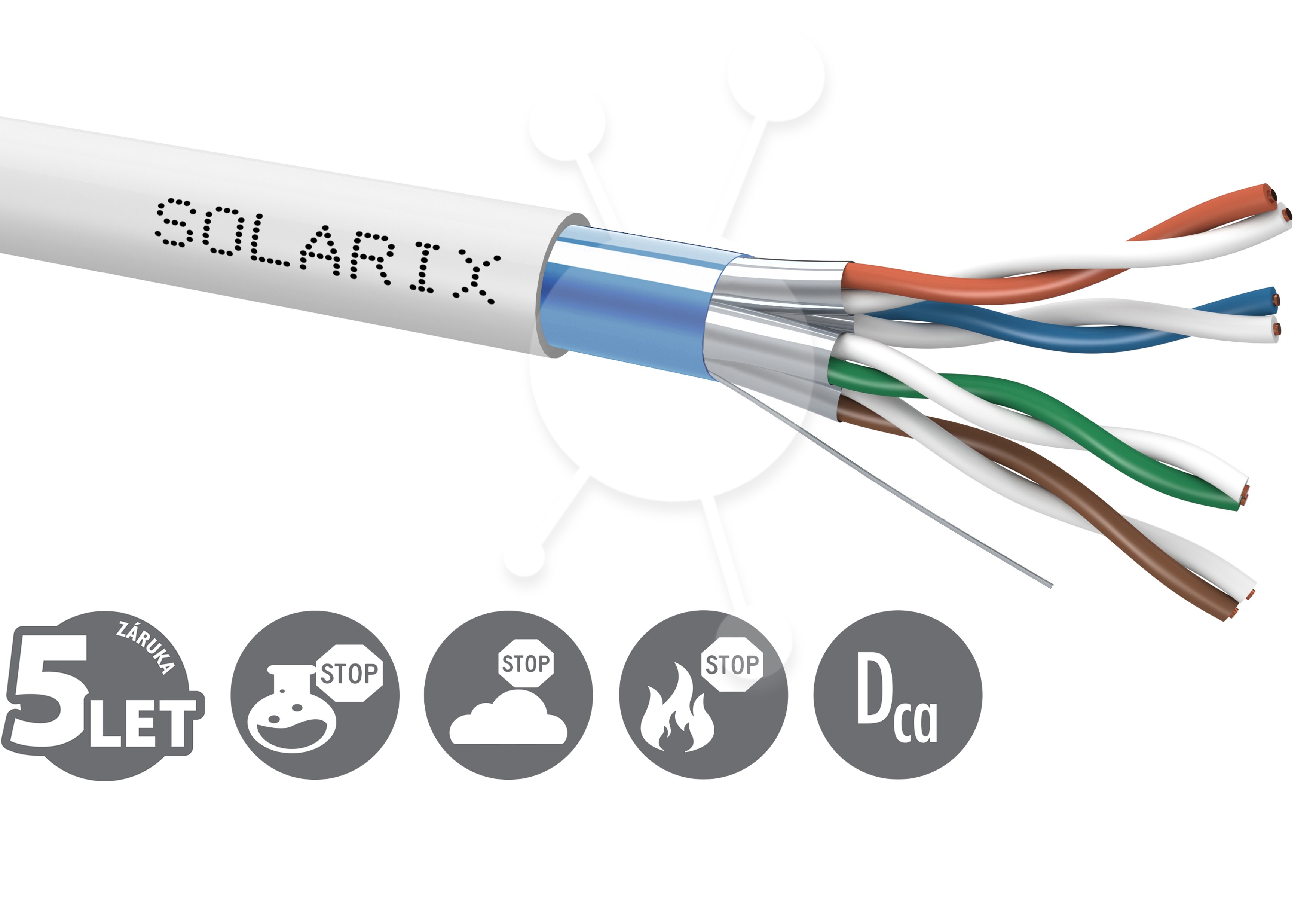 Instalační kabel Solarix s označením SXKD-6A-FFTP-LSOH je vysoce kvalitní dvakrát stíněný kabel kategorie 6A, který je určený pro provoz vysokorychlostních ethernetových protokolů, včetně 10GBASE-T. Konstrukce kabelu je F/FTP, typ pláště LSOH s třídou reakce na oheň Dca-s2,d2,a1. Vodiče kabelu jsou vyrobeny z kvalitního měděného drátu s čistotou mědi 99,97 %. Kabel bez problémů splňuje požadavky z mezinárodních standardů ISO/IEC 11801, EN 50173 a ANSI/TIA 568.2-D. V případě CPR (nařízení EU č. 305/2011) je kabel testován u nezávislé laboratoře FORCE TECHNOLOGY v systému posuzování vlastností AVCP 3. Stejně jako ostatní kabely Solarix, je i kabel SXKD-6A-FFTP-LSOH značen metráží po 1 m v rozsahu od 0 do 500 m. Kabel je dodáván na vysoce pevné dřevěné cívce, na které jsou uvedeny všechny nezbytné produktové informace, včetně čárových kódů, výrobní šarže, popisu a nejdůležitějších technických parametrů.