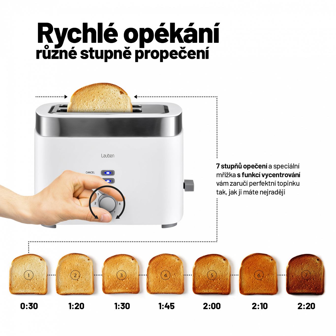 Každý druh pečiva potřebuje jiné nastavení, stejně tak každý máme jiné chutě. S Lauben Toaster si můžete vybrat ze 7 stupňů opečení pečiva, na své si tak přijdou milovníci pečiva opečeného dohněda i ti, kteří raději lehce zlatavou křupavou variantu.