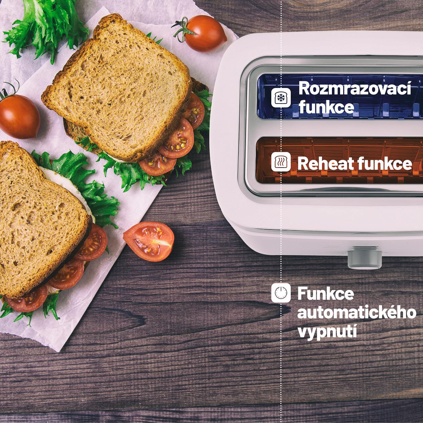 Kromě opékání čerstvého pečiva můžete v topinkovači rozmrazit i pečivo, které jste si uložili do mrazáku. Stačí stisknout tlačítko Defrost a za několik chvil máte připravenou křupavou snídani. Díky funkci Reheat můžete kdykoli pečivo znovu ohřát, což oceníte třeba když nestíháte.