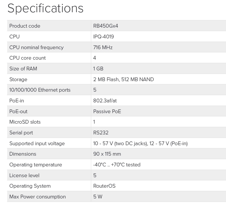 Mikrotik RB450Gx4 716 MHz, 1 GB RAM, Router OS L5