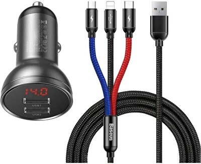 Baseus rychlonabíječka do auta 2xUSB 4,8A 24W s displejem + 3v1 kabel černá