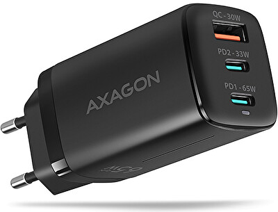 AXAGON ACU-DPQ65, GaN nabíječka do sítě 65W, 3x port (USB-A + dual USB-C), PD3.0/QC4+/PPS/Apple