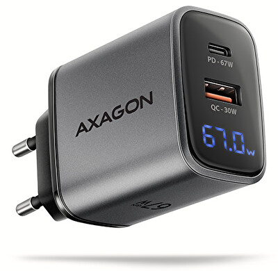 AXAGON ACU-PQ67D, GaN nabíječka do sítě 67W, výstup USB-A + USB-C, PD3.0/PPS/QC4+/SFC2.0/Apple, LCD