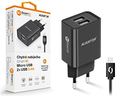 Chytrá síťová nabíječka ALIGATOR 2,4A, 2xUSB, smart IC, černá, micro USB kabel