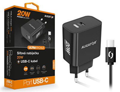 Chytrá síťová nabíječka ALIGATOR Power Delivery 20W, USB-C/USB-C kabel, černá