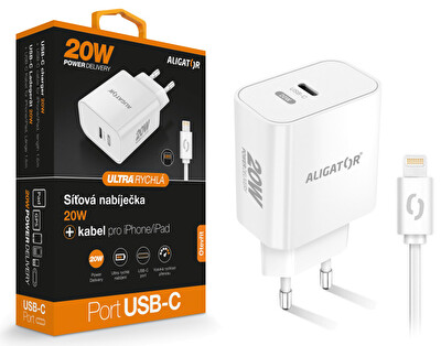 Chytrá síťová nabíječka ALIGATOR Power Delivery 20W, USB-C kabel pro iPhone/iPad, bílá
