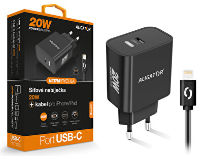 Chytrá síťová nabíječka ALIGATOR Power Delivery 20W, USB-C kabel pro iPhone/iPad, černá