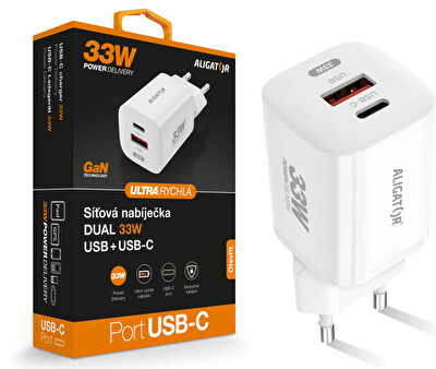Chytrá GaN síťová nabíječka ALIGATOR Power Delivery 33W, USB-C + USB-A, bílá