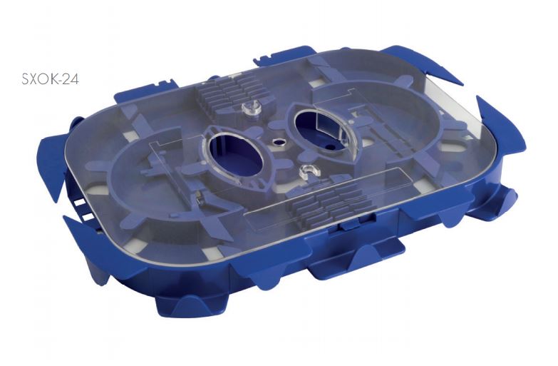 Optická kazeta pro 24 svárů SXOK-24 Optická kazeta disponuje unikátním systémem pro vedení vláken jak ve vnitřní části, tak i na vnější části po jejím obvodu. Součástí optické kazety jsou dva dvoupatrové hřebínky, které společně pojmou kapacitu až 24 ochran svárů. Uchycení a konstrukční řešení výklopných hřebínků umožňuje vedení vláken pod nimi samotnými. Součásti sady je průhledné plastové víko, které díky jednotlivým uchytům umožňuje pevné stohování kazet. Stohované kazety je možno vyklápět díky přídavným plastovým pantům. Vně optické kazety se nachází nástroj (plastový háček), který usnadňuje práci a manipulaci při ukládání optických vláken. Hřebínky v kazetě jsou kompatibilní pro ochrany svárů do průměru max. 2,2mm.