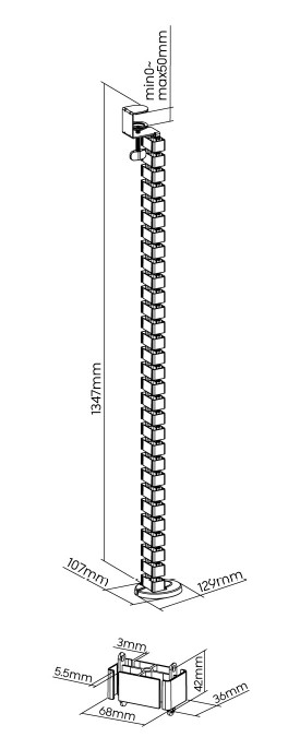 Organizér se skládá z 30 odnímatelných článků, které umožňují jeho ohýbání a zakřivení. Každý článek je rozdělen na čtyři sekce, takže můžete kabely rozdělit podle funkce nebo typu. Struktura článků umožňuje, aby se organizér prodlužoval nebo zkracoval v závislosti na aktuálně nastavené výšce polohovatelného stolu. Kovová základna poskytuje dostatečnou hmotnost proti samovolnému posunu organizéru po podlaze.
