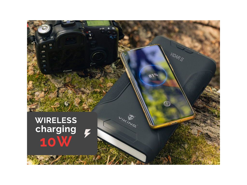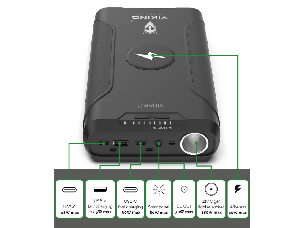 Outdoorová powerbanka Viking VIDAR II • Kapacita: 72000mAh/266.4Wh • Maximální výkon: 180W • Zabudované LED světlo • Široká škála vstupů a výstupů (USB-A, USB-C, Cigaretová zásuvka, DC-jack, WIRELESS Qi) • Možnost solárního napájení • Funkce Pass-Through • Odolnost IP65 Outdoorová powerbanka Viking VIDAR II