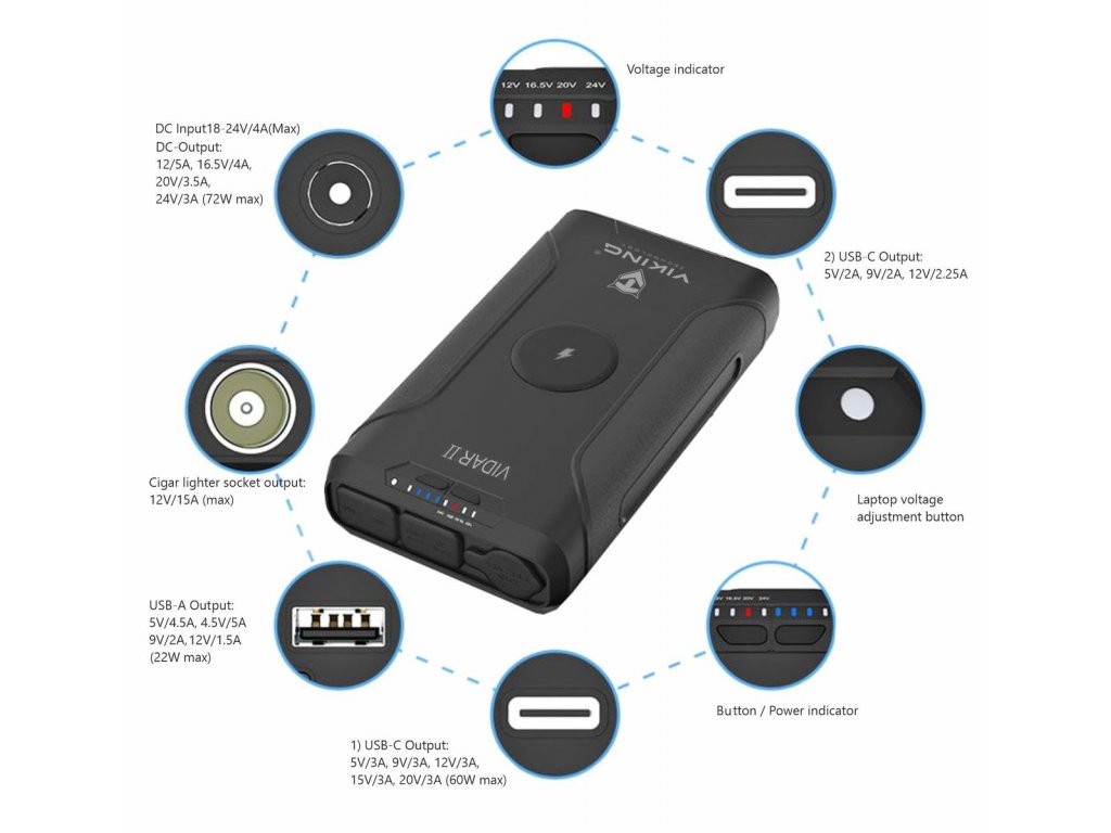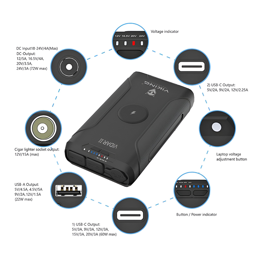 Powerbanka Viking VIDAR II je spolehlivý pomocník pro každého, kdo potřebuje mít energii vždy po ruce – ať už na vícedenním kempování, při práci v terénu nebo na cestách. S kapacitou 72000?mAh, kompaktními rozměry a širokým výběrem výstupů pohodlně nabijete více zařízení současně – od mobilních telefonů přes notebooky až po 12V spotřebiče.