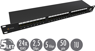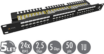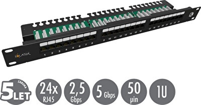 19" patch panel Solarix 24 x RJ45 CAT5E UTP s vyvazovací lištou 1U SX24L-5E-UTP-BK-N