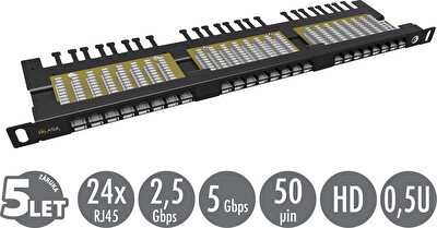 19" patch panel Solarix 24xRJ45 CAT5E UTP s vyvazovací lištou černý 0,5U SX24HD-5E-UTP-BK