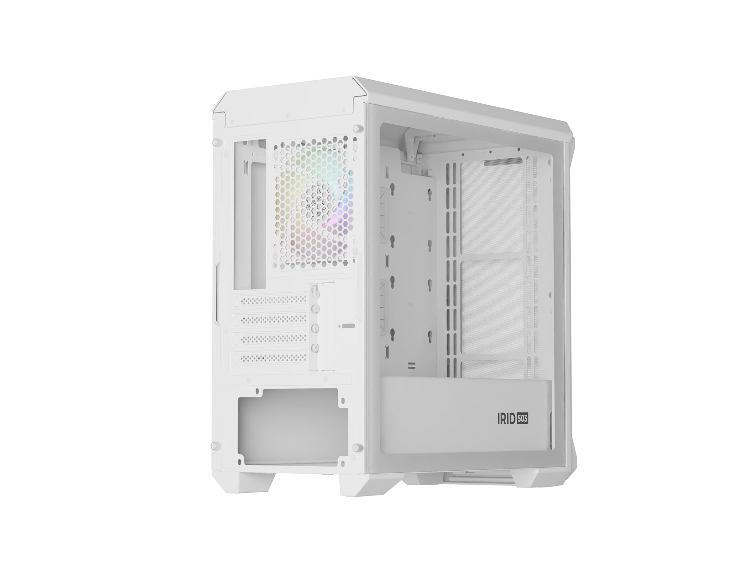 Irid 503 ARGB LITE má perforovanou přední stranu a boční panel je vyroben z čirého tvrzeného skla. Toto řešení umožní na první pohled vidět pracovní komponenty. Varianta LITE je také vybavena jedním ventilátorem OXAL ARGB 120, který zajišťuje podporu dostatečné cirkulace vzduchu uvnitř skříně.