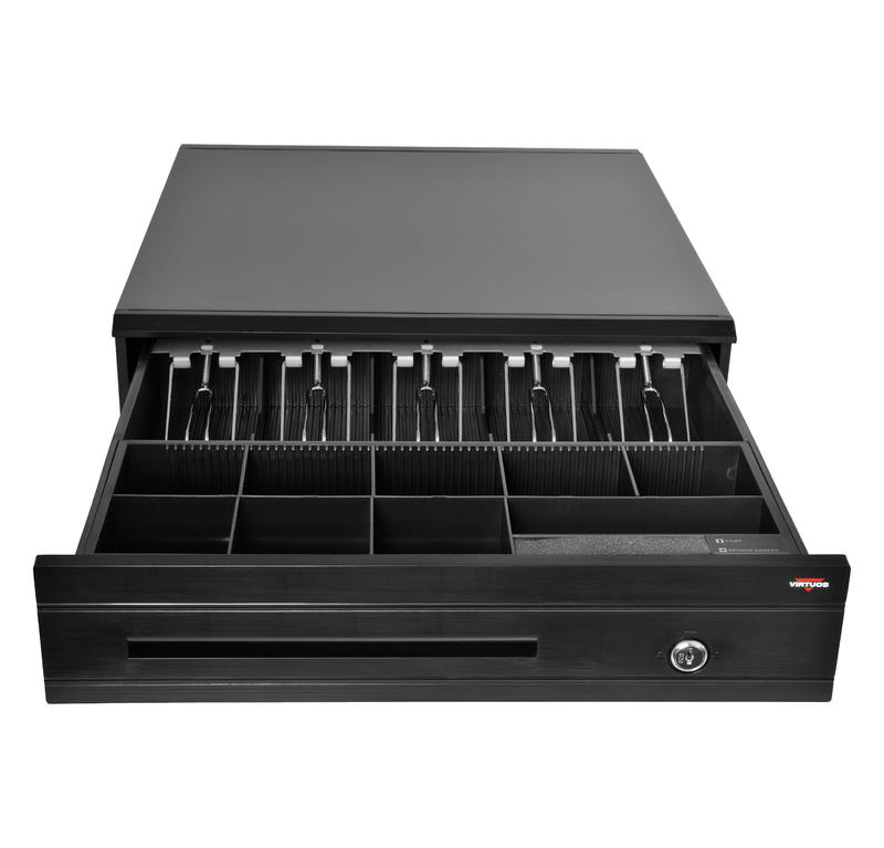 Pokladní zásuvka C425C - s kabelem, kovové držáky, 9-24V, černá