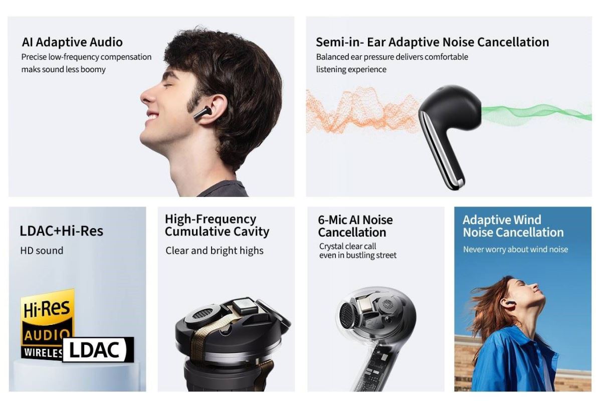 Po zapnutí ANC se bezdrátová sluchátka automaticky přizpůsobí vašemu zvukovodu, dynamicky detekují změny okolního hluku a stavu nošení a dynamicky upravují a přizpůsobují nejvhodnější parametry potlačení hluku v reálném čase, čímž zajistí, že okolní hluk je účinně eliminován. Konstrukce také zahrnuje vodotěsnou a adaptivní strukturu proti větru IPX5, takže jsou ideální pro outdoorové aktivity.