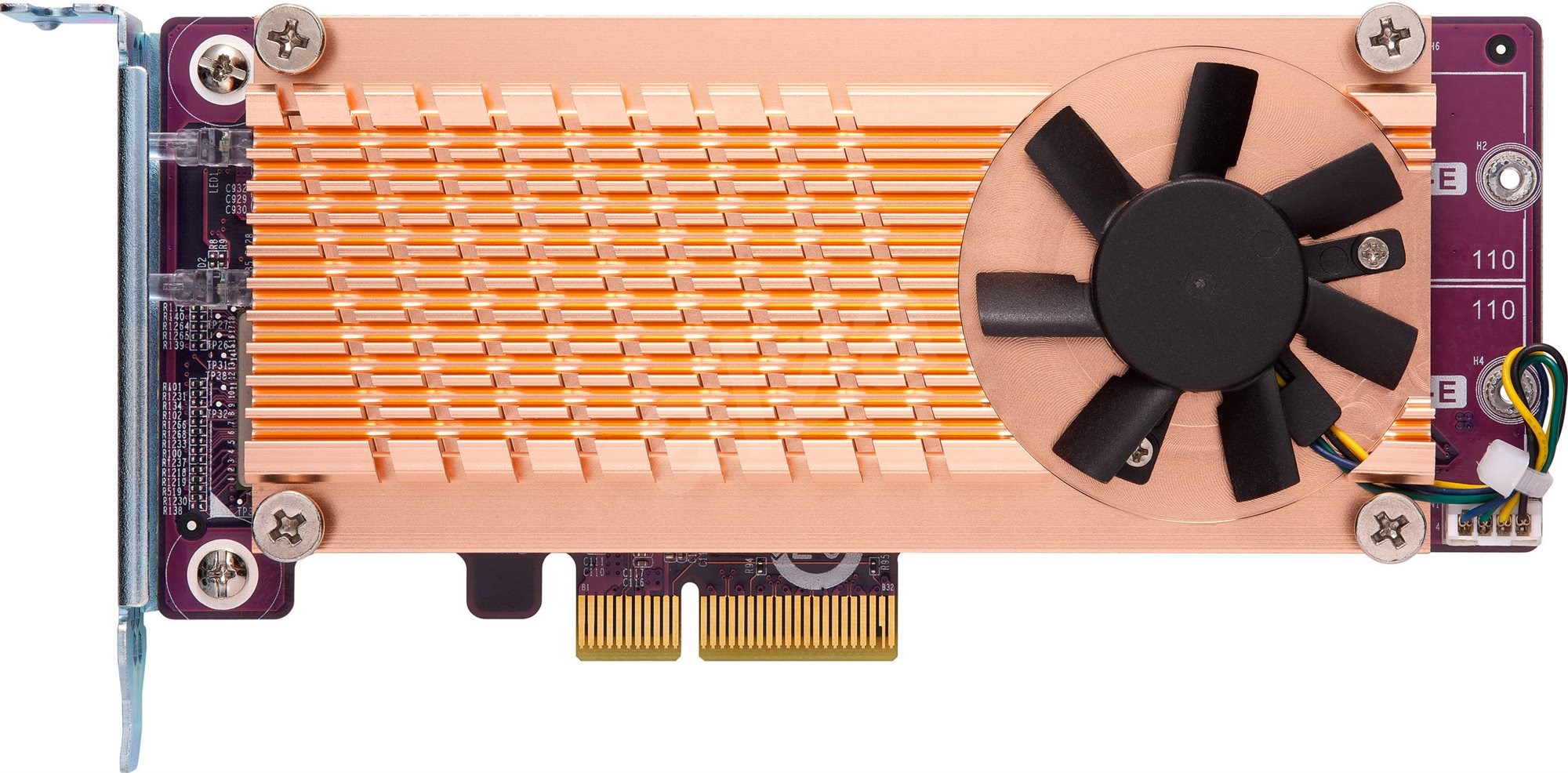 QM2-4P-384 - Rozšiřující karta QM2 (přidání slotů M.2 SSD) Karty PCIe QM2 přidávají QNAP NAS zařízením podporu pro M.2 SSD, takže uživatelé mohou konfigurovat SSD cache, caching pool nebo svazek s automatickým stupňováním pro zlepšení celkového výkonu NAS. Rozšiřující karta pro čtyři M.2 2280 PCIe NVMe SSD Konektor: 4 x sloty M.2 2280 PCIe (Gen3 x 4) NVMe SSD PCIe a kanály: PCIe Gen3 x 8 Držák: Nízkoprofilový (výchozí). Součástí dodávky je také nízkoprofilový plochý držák a držák s úplnou výškou. Rozměry: 204.95 x 68.9 x 20.6 mm Vhodné pro modely: x73, TS-x77, TVS-x82, TS-x80U, TS-x80U-SAS, TS-1685, TS-x85U