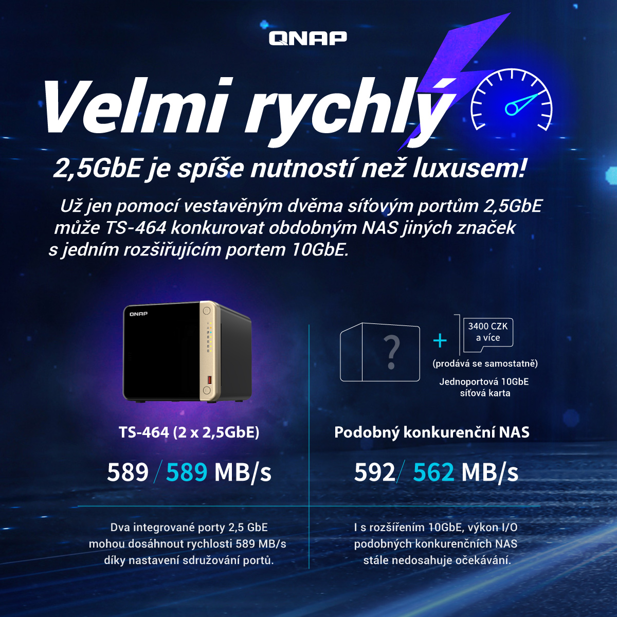 Čtyřjádrový dvouportový 2,5GbE NAS s Intel procesorem nabízí využití M.2 SSD cache a rozšiřitelnost PCIe pro vysokorychlostní přenos a virtualizační aplikaceOdkaz na web výrobce: https://www.qnap.com/cs-cz/product/ts-464