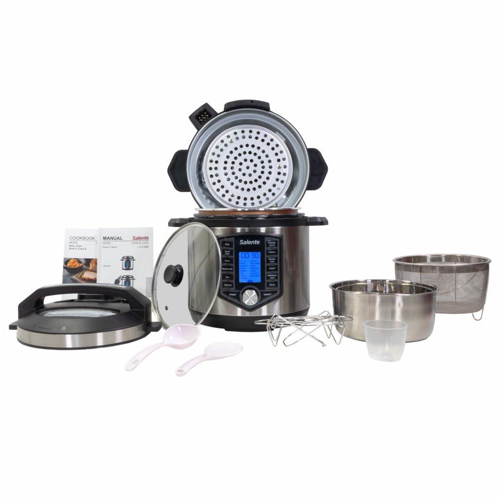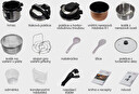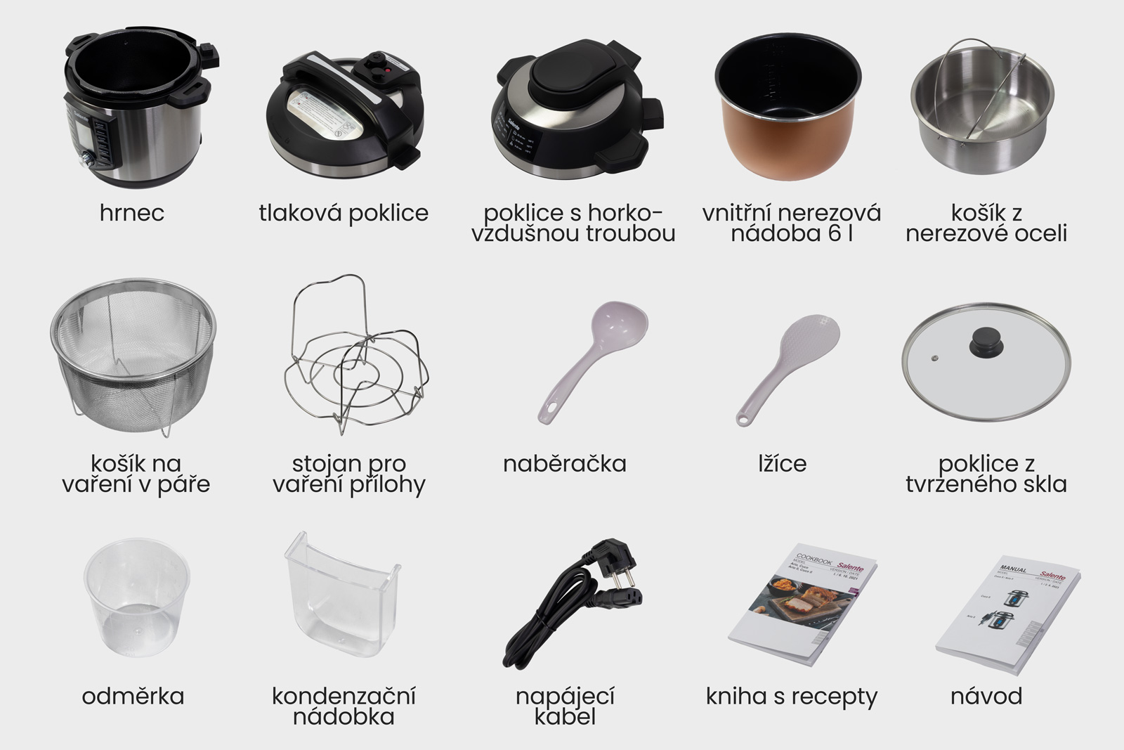 • Hrnec • Tlaková poklice • Poklice s horko-vzdušnou troubou • Vnitřní teflonová nádoba 6L • Nerezová nádoba na přílohy • Košík z nerezové oceli na fritování / vaření v páře • Stojan pro vaření přílohy • Naběračka • Lžíce • Poklice z tvrzeného skla • Odměrka • Kondenzační nádobka • Napájecí kabel • Kuchařka návod • Návod