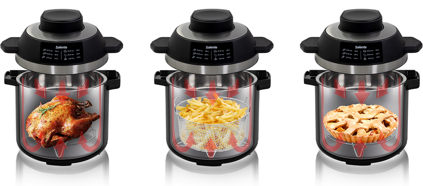 Horkovzdušná trouba, která je součástí balení, peče shora. Díky hornímu ohřevu dokážete připravit například menší kuře s křupavou kůžičkou, hranolky nebo koláč. Horkovzdušnou troubu můžete použít i jako doplněk po takovém vaření třeba jen k zapečení jídla.