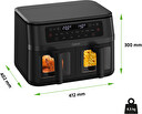 Když zrovna tuto kompaktní fritézu nepoužíváte, můžete ji bez potíží uložit do takřka jakékoliv skříňky kuchyňské linky. Její rozměry jsou totiž i přes dvojitou kapacitu pouhých 412 × 402 × 300 mm (při hmotnosti 8,5 kg).