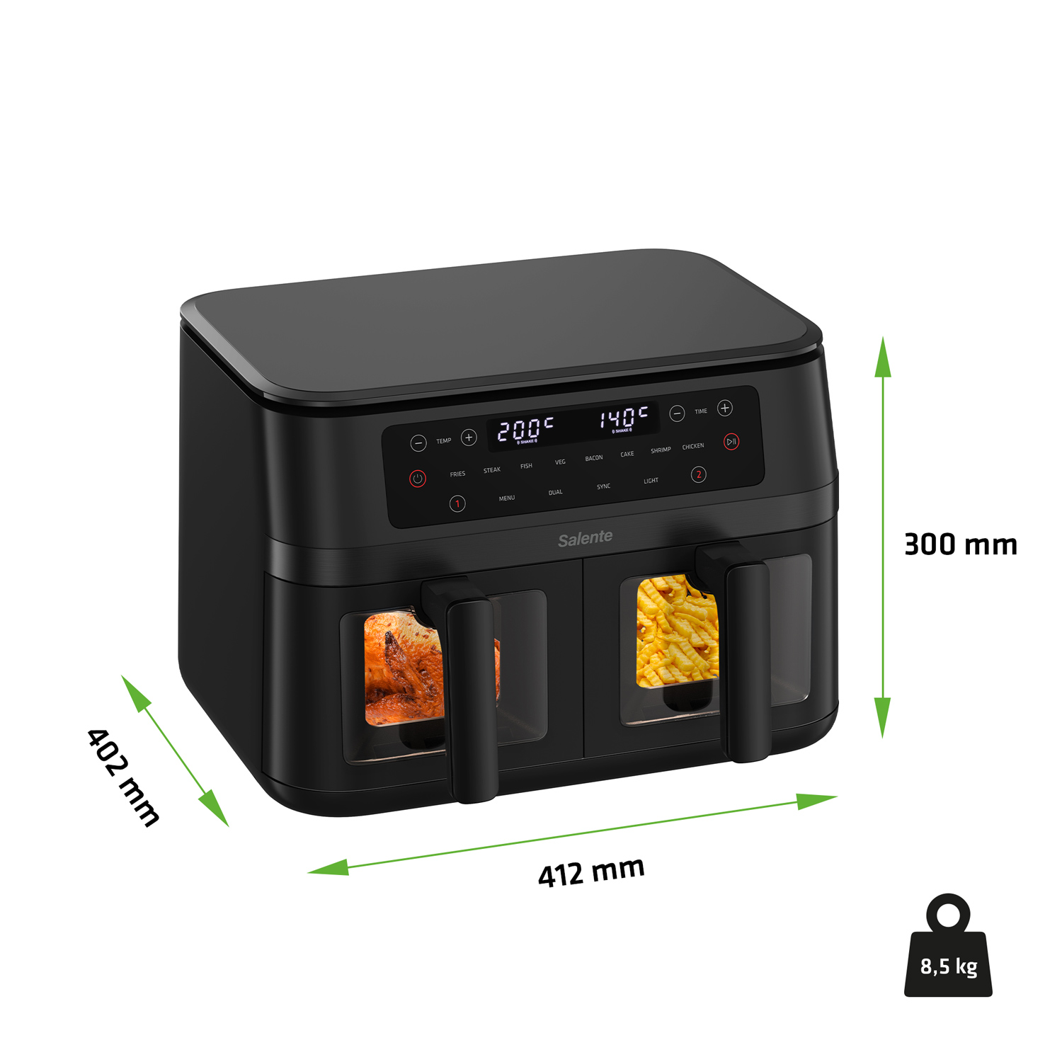 Představte si, že si doma připravujete křupavé hranolky, šťavnaté steaky nebo neodolatelný sladký dezert, a přitom si neděláte starosti s nezdravým tukem ani zbytečnými kaloriemi navíc. Horkovzdušná fritéza Salente DoubleAir převede tenhle sen v realitu. Místo ponoření do oleje totiž využívá horký cirkulující vzduch. Díky tomu vytváří na chystaných ingrediencích křupavou texturu, ovšem s minimem tuku. Umí fritovat i grilovat a k jejím výhodám patří i přítomnost dvou nezávislých fritovacích košů (s celkovým objemem 11 litrů) pro přípravu dvou různých pokrmů najednou. Z vaší kuchyně zkrátka vykouzlí místo, kde si opojné chutě a vůně podávají ruku se zdravým životním stylem.