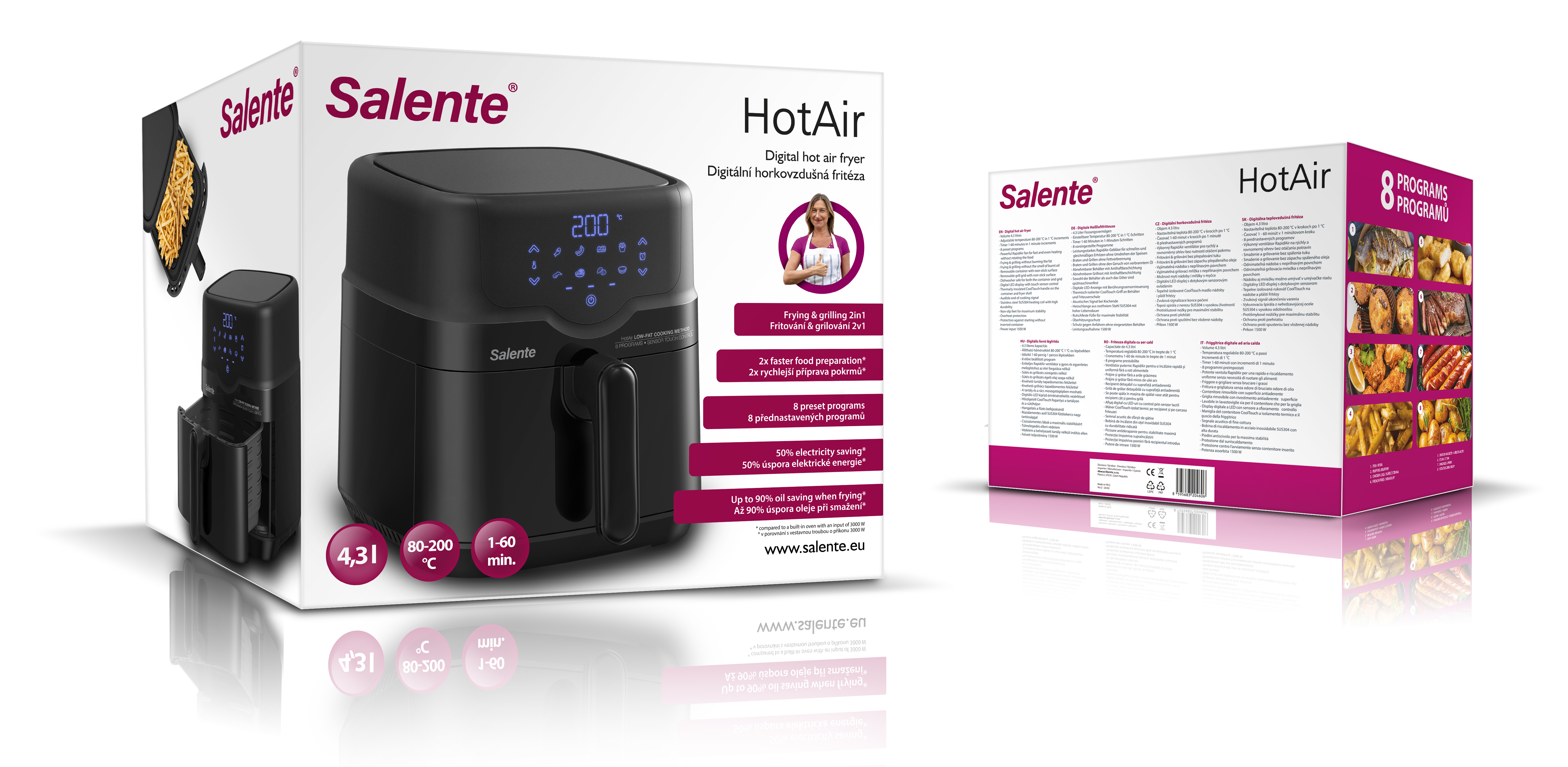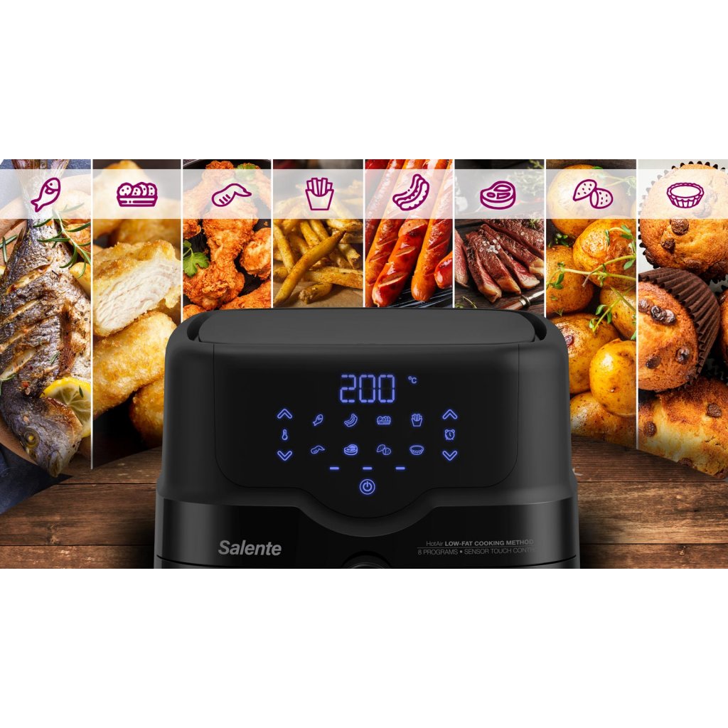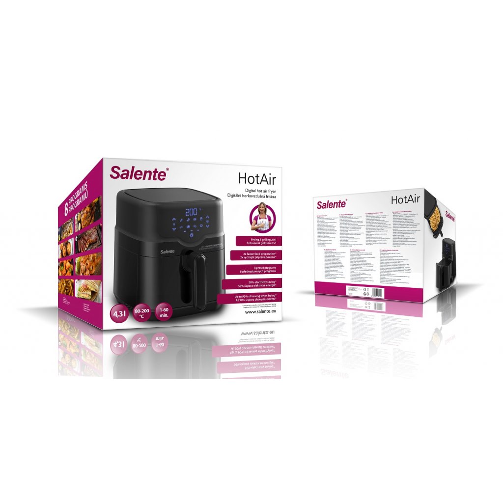Horkovzdušná fritéza Salente HotAir splňuje současné nejvyšší nároky na zdravou a rychlou přípravu pokrmů a nabízí kombinaci dvou způsobů přípravy - fritování i grilování. I těm nejnáročnějším kuchařům a kuchařkám umožňuje nastavení teploty v rozsahu 80-200 °C v krocích po 1 °C a nastavení času přípravy pokrmu v rozsahu 1-60 minut v krocích po 1 minutě.