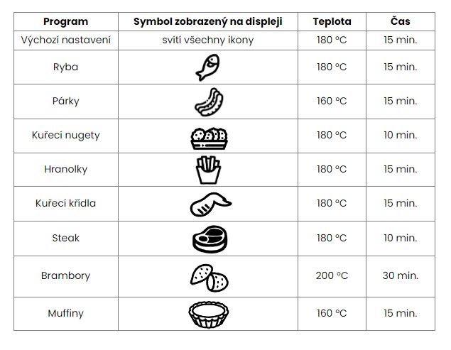 K neuveřitelné rychlosti přípravy pokrmu vám dopomůže nejen rychlý horkovzdušný princip vaření jako takový, ale i 8 přednastavených programů, kdy pokrm připravíte pouhým dotykem na některý z osmi receptů na dotykovém ovládacím panelu. O zbytek se už fritéza postará sama – nastaví doporučený čas i teplotu. Vrcholem komfortu je možnost individuálního donastavení času i teploty – i u předvoleb totiž můžete dle libosti čas nebo teplotu změnit tak, aby maximálně vyhovovala vašim kulinářským zkušenostem.