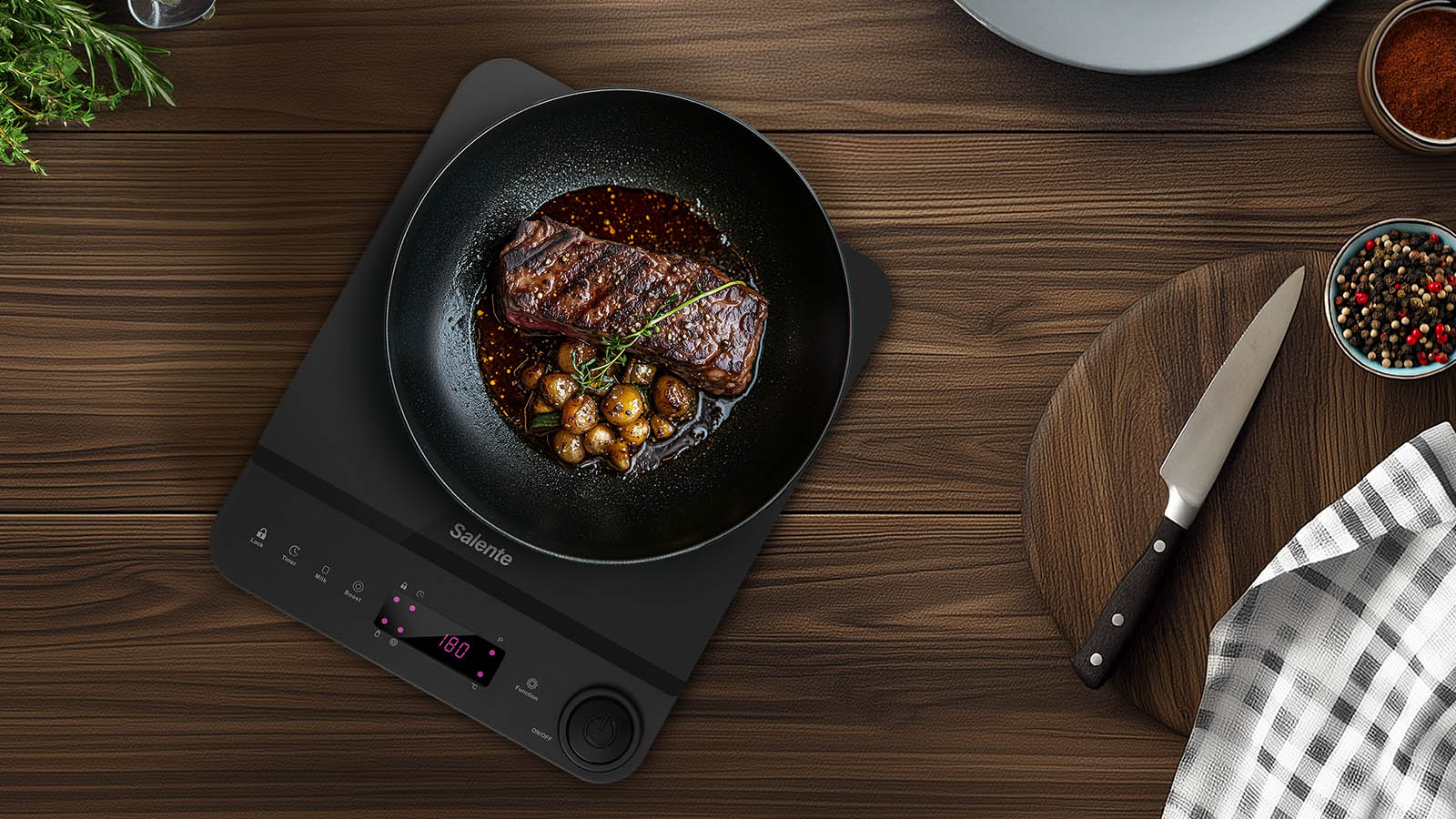 Nezabírá skoro žádné místo, ale zvládne uvařit takřka cokoliv. O čem je řeč? Přece o jednoplotýnkovém indukčním vařiči Salente InductPro1, který se pyšní kompaktním a ultratenkým designem (výška jen 4,5 cm), takže se bez problému vejde i do té nejmenší kuchyňky, na chatu nebo třeba do karavanu. Svoje oblíbená domácí jídla si s ním zkrátka můžete pohodlně připravovat kdekoliv, kde máte k dispozici zásuvku.