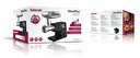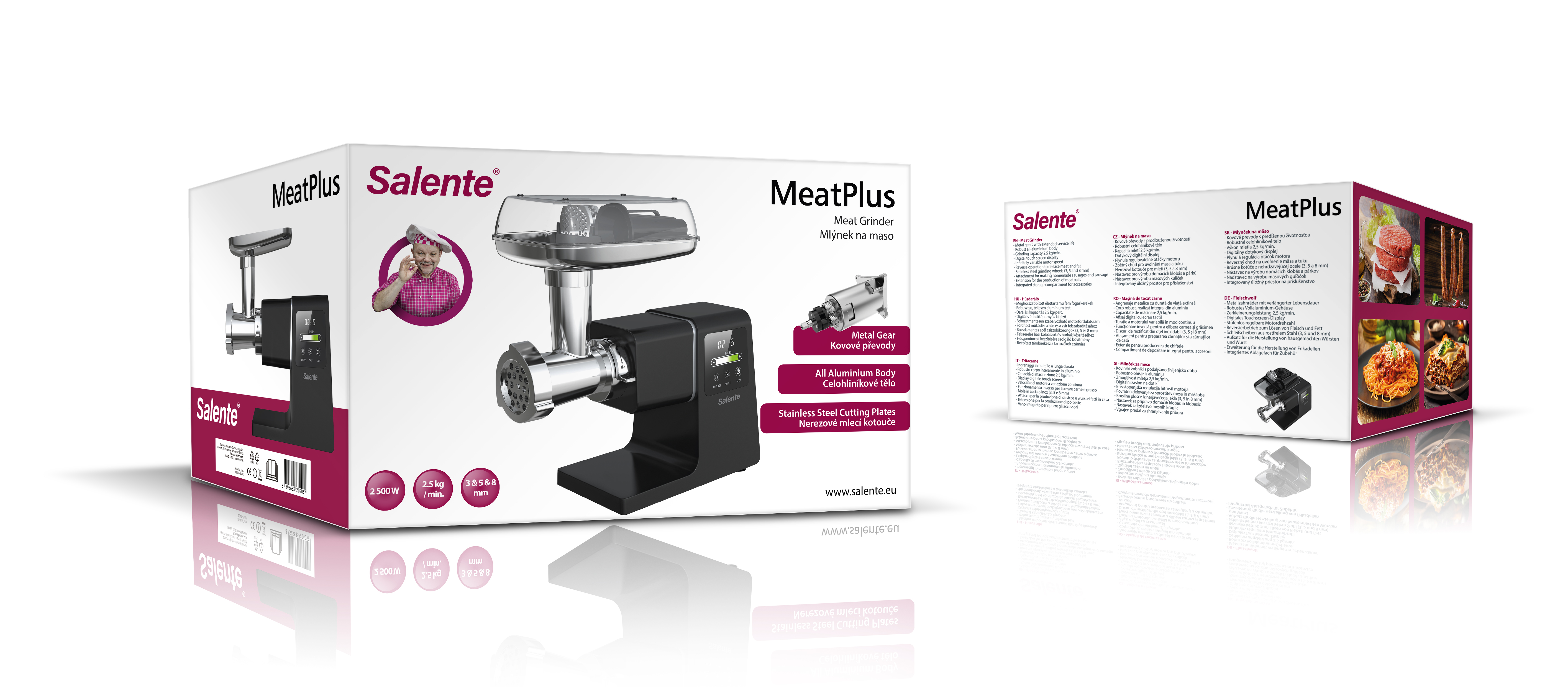• Robustní celokovové tělo • Výkonný motor 2500 W • Kapacita mletí: 2,5 kg masa za minutu • Kovové převody motoru s extra prodlouženou životností • 6 rychlostí mletí • Extra velký užitný průměr masomlýnku 65 mm pro zpracování např.: 1) Mletého masa do boloňských špaget a zapékaných pokrmů 2) Masa do karbanátek a sekané 3) Masa do hamburgerů 4) Masa na tatarský biftek 5) Masa pro masové kuličky kebbe • 3 velikosti mlecích disků na maso: 1) Jemný mlecí disk (průměr otvorů 3 mm) 2) Středně hrubý mlecí disk (průměr otvorů 5 mm) 3) Hrubý mlecí disk (průměr otvorů 8 mm) • Robustní šířka mlecích disků 0,5 cm pro maximální odolnost a dlouhou životnost • Digitální LED displej zobrazuje: 1) Čas mletí 2) Rychlost otáček • Dotykovým senzorové ovládání integrované v displeji s funkcemi: 1) Start 2) Stop 3) Volba rychlosti 4) Zpětný chod • Dotykový slider pro velmi rychlé navolení rychlosti mletí • Zpětný chod pro uvolnění masa a tuku v ucpané mlecí komoře • OneClick systém pro velmi rychlé, pevné a jednoduché zajištění mlecí komory v mlýnku • Robustní mlecí komora ze slitiny hliníku • Nástavec pro výrobu domácích klobás a párků • Nástavec pro výrobu masových kuliček kebbe • Devítihřídelová extra robustní spojka mlecího šneku s prodlouženou životností • 6 spirálových vnitřních vodících vřeten mlecí komory pro eliminaci ucpání komory • 2,4 cm šířka šroubovacího uzávěru mlecí komory pro jednoduchou manipulaci i s mastnými prsty při výměně mlecích disků • Integrovaný úložný prostor pro veškeré příslušenství v podávací misce • Průhledné víko na příslušenství chránící jej proti prachu • Mlecí disky a mlecí nůž vyrobeny z vysoce kvalitního a odolného nerezu třídy SUS420 • 2 přední gumové nožičky pro eliminaci vibrací a maximální stabilitu • 2 zadní přísavné antivibrační nožičky pro maximální stabilitu • Dvojitá bezpečnostní ochrana: 1) Při přehřátí motoru 2) Při přetížení motoru • Autodiagnostika s indikací chybových hlášení na displeji • příkon: 2500 W (nom. příkon 400 W) • Hlučnost: 66 dB(A) • Délka přívodního kabelu: 1 m • Jmenovité napětí: 220-240 V • Jmenovitý kmitočet: 50 Hz • LFGB certifikace pro nezávadný styk s potravinami • Evropské certifikace LVD, EMC, RoHS • Rozměry bez nasazeného příslušenství (š × h × v): 26 × 14,2 × 22,1 mm • Rozměry s mlýnkem na maso a podávací miskou (š × h × v): 35,8 × 16,5 × 32,2 mm • Hmotnost bez nasazeného příslušenství (bez kabelu): 3,35 kg • Hmotnost se sestavenou mlecí komorou a podávací miskou (bez kabelu): 4,23 kg