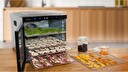 • Celonerezové robustní provedení • Extra velká sušící plata (39,4 × 39,4 cm) • Sušící plocha 1552 cm2 • Ideální pro sušení hub, ovoce, zeleniny, bylinek, čaje, masa atp. • Extra výkonný 18 cm ventilátor pro horizontální rovnoměrný přenos teplého vzduchu • Rovnoměrné sušení ve všech patrech bez nutnosti otáčení surovin a přeskladávání sušících plat • 10 nerezových sušících plat • 10 vložek na plata s jemným síťováním pro sušení jemnějších a lepkavých surovin (např. hub, bylinek, banánů, rajčat atp.) • Speciální odkapávací tác usnadňuje čištění při sušení surovin s vyšším obsahem šťávy • Nerezová plata lze mýt v myčce • Beztlačítkový dotykový digitální ovládací panel s displejem • Vysoce kontrastní modrý LCD displej • Časovač s automatickým vypnutím po ukončení programu • Rozsah nastavení teploty: 35-75 °C v krocích po 5 °C • Rozsah nastavení časovače: 30 min. až 24 hodin v krocích po 30 minutách • Možnost libovolně měnit teplotu a čas i v průběhu sušení • Dvojitý nerezový plášť zajišťuje: 1) rychlejší sušení 2) lepší tepelně izolační vlastnosti 3) nižší spotřebu • Velkoplošné průhledové okénko (35 × 26 cm) • Dvířka s magnetickým uzavíráním • Postranní zapuštěná madla pro snadné přenášení • Gumové protiskluzové nožičky • Tepelná pojistka proti přehřátí • LFGB certifikace pro nezávadný styk sušících plat s potravinami • Evropské certifikace LVD, EMC, RoHS • Jmenovitý příkon: 900-1100 W • Jmenovité napětí: 220-240 V • Jmenovitý kmitočet: 50/60 Hz • Hlučnost: 52 dB • Délka přívodního kabelu: 1 m • Rozměry (š × h × v): 43 × 53,2 × 41,5 cm • Hmotnost: 17,2 kg