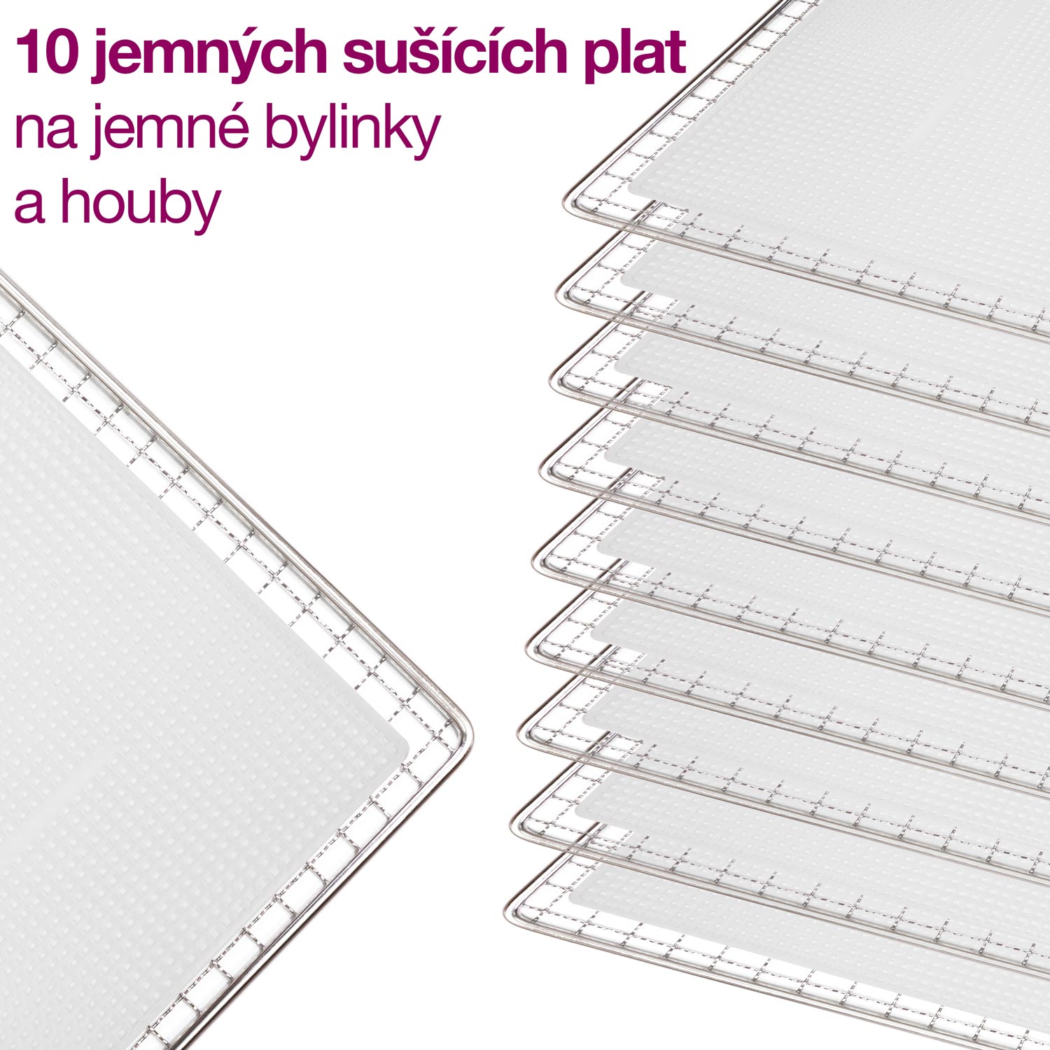 Součástí dodávky u tohoto modelu je 10 velkoplošných nerezových sušícíh plat, která je navíc možné mýt v myčce na nádobí. Rozměr plat je 39,4 × 39,4 cm a nabízí tak rekordních 1552 cm2 sušící plochy. Plata jsou vyrobena z vysoce kvalitního zdravotně nerezu a celá sušička splňuje velmi přísnou LFGB normu pro přímý styk s potravinami. Nerez navíc nabízí prodlouženou životnost.