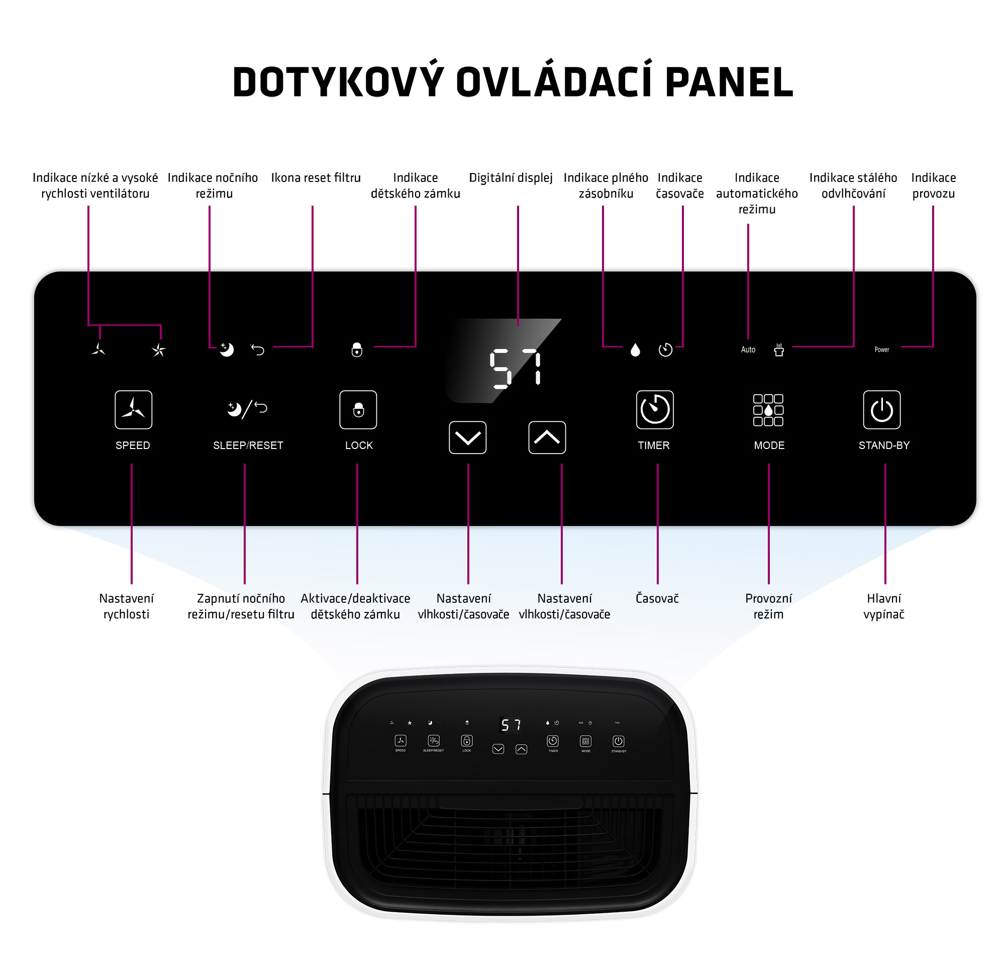 11) dotykový ovládací senzor pro zapnutí/vypnutí odvlhčovače