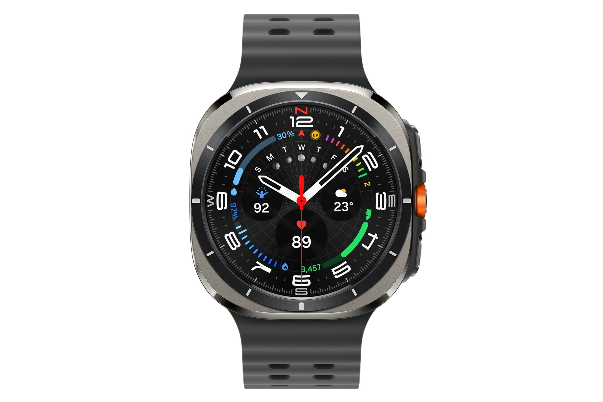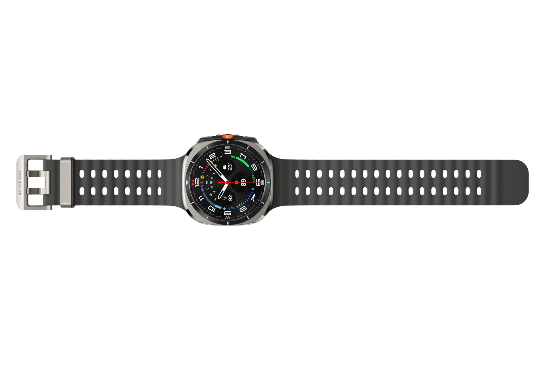 Nejodolnější Galaxy Watch všech dob Překonej hranice s Galaxy Watch Ultra, které odolají teplotě až 55 °C, bez problémů zvládnou nadmořskou výšku 9 000 m a tlak vody až 10 ATM. O jejich plynulý provoz se přitom postará výkonný 3nm procesor. Posílená baterie vydrží v úsporném režimu až 100 hodin, takže chytré hodinky můžeš vzít i na několikadenní túru. Nový BioActive senzor doplněný o Galaxy AI navíc pečlivě monitoruje tvůj zdravotní stav a pomáhá ti s dosahováním tvých cílů. *Extrémní odolnost pro všechna tvá dobrodružství *Přesné monitorování všech tvých sportovních výkonů *Užívej si celé dny bez nutnosti nabíjení s dlouhou výdrží Displej - úhlopříčka [palce]: 1.47" Displej - rozlišení [pix]: 480 x 480, 327 ppi Procesor: Exynos W1000 (5 core, 3 nm) Paměť: 2.0 GB RAM + 32 GB internal memory Materiál hodinek: Titanium Funkce: *Heartrate sensor, ECG, Blood Pressure, BIA, Continuous SpO2, Skin Temperature, Energy Score, Medication, AGEs (Labs) *Senzory: Accel. (32G), Gyro, Baro, Ambient Light, Compass, Temperature *Mic, Speaker, New Haptic Motor (Horizontal), Digital Bezel, Quick Button, Siren Konektivita: Bluetooth 5.3, Wi-Fi 2.4 GHz & 5 GHz, NFC, LTE, Dual GPS (L1+L5) Voděodolnost: 10 ATM + IP68, MIL-STD-810H Baterie: *Kapacita [mAh]: 590 mAh *WPC Wireless Charging + Fast Charging Rozměry [mm]: 47.4 x 47.4 x 12.1 mm Hmotnost [g]: 94 g Obsah balení: Quick Start Guide, Strap, Wireless Charging Dock
