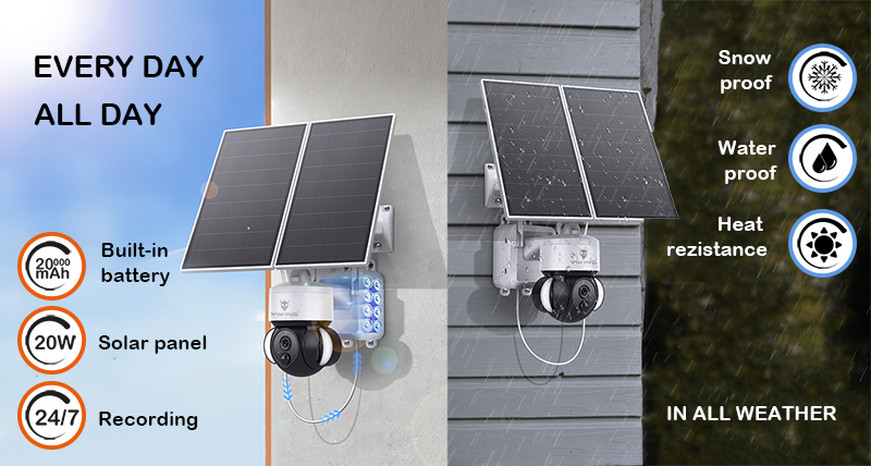 Otočný motorizovaný objektiv · ochrana IP66 · IR i barevné noční vidění až 30m · typ připojení 4G · TF/SD card uložiště · Cloud uložiště · Full HD 1080P rozlišení, výkon solárního panelu 20W max. · kapacita baterie 20000 mAh · PIR funkce · mobilní notifikace · ovládání přes mobilní aplikaci
