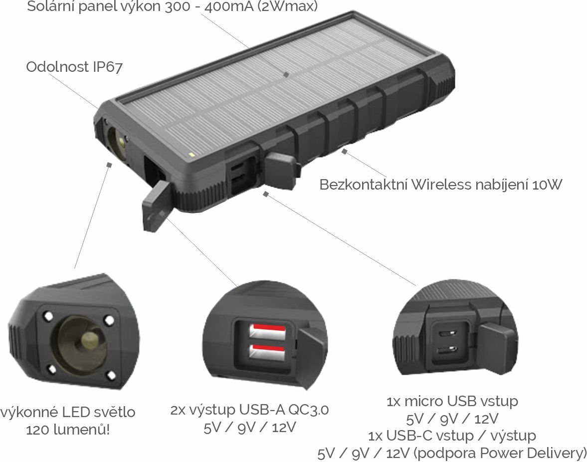 Kapacita 24000mAh • rychlonabíjení QC3.0 a Power Delivery • wireless bezdrátové nabíjení 10W • výkonný solární panel 300mA max.• podpora vlastního rychlonabíjení až 18W.