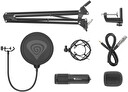 Obsah balení: Mikrofon, stolní držák s ohebným ramenem, Pop-filtr, pěnová houba, anti-vibrační košík