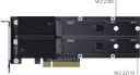 Synology M2D20 je karta adaptéru M.2 NVMe SSD určená k navýšení výkonu vstupu/výstupu zařízení NAS. Schopnost zpracování více front disků NVMe SSD významně napomáhá v aplikacích citlivých na latenci, jako je indexování fotografií, hledání souborů a nasazení virtualizace.