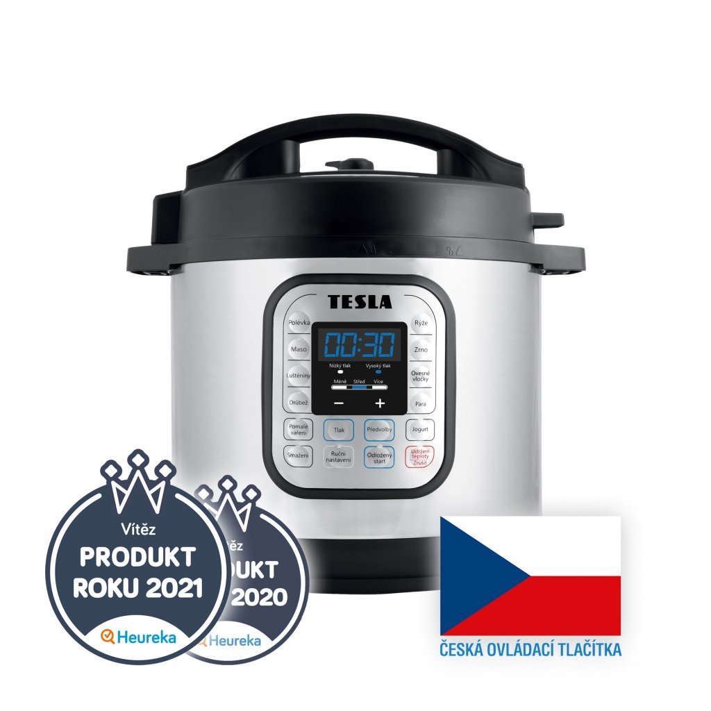 TESLA EliteCook K70 - multifunkční elektrický tlakový hrnec Pokročilé funkce pro pohodlné vaření pro celou rodinu! S multifunkčním elektrickým tlakovým hrncem TESLA EliteCook K70 můžete vařit pod tlakem, vyrobit si vlastní jogurt, vařit na páře, využít pomalé vaření nebo odložený start nebo si pochutnat například na klasickém vývaru, guláši, hovězí/vepřové pečeni, kuřeti, chilli, těstovinách, masových kuličkách, zelí, perkeltu, bramborách, rýži, luštěninách a dalších - podobně jako v klasickém tlakovém hrnci. multifunkční elektrický tlakový hrnec *10v1: tlakový hrnec, pomalý hrnec, rýžovar, jogurtovač, vařič vajíček, ohřívač jídla, pánev na smažení nebo restování, napařovací hrnec, sterilizátor, hrnec na přípravu dušeného masa *ovládací tlačítka na předním panelu v češtině *vnitřní hrnec z nerezové prémiové oceli, který se snadno čistí a lze jej mýt v myčce na nádobí *30 naprogramovaných hodnot pro snadné a rychlé vaření *až o 70% rychlejší než běžný způsob vaření - šetří čas, energii a peníze *digitální ovládání s velkým LCD displejem *ruční nastavení délky vaření a tlaku *dvě úrovně nastavení tlaku (Vysoký tlak/Nízký tlak) *možnost smažení/restování/zahuštění pokrmu bez horního víka *program "Smažení" se třemi úrovněmi teploty *odložený start (časovač) až 24 hodin *bezpečné vaření bez kompromisů s mnoha bezpečnostními pojistkami *pohodlná příprava jídla pro všechny, kdo nechtějí trávit hodně času v kuchyni *zachovává nutriční hodnotu připravovaného pokrmu *zdravé, bezpečné a rychlé vaření doma, na chatě nebo v kempu *během vaření nevytváří téměř žádnou páru, zápach nebo hluk *úspora energie a času *držák pro horní víko na každé straně hrnce, vhodné pro leváky i praváky *mikroprocesorem řízená regulace teploty pro přesné nastavení bezpečného tlaku v hrnci *výborný pro vaření pod tlakem a pomalé vaření *automatické udržování teploty udržuje jídlo teplé do okamžiku, kdy je připraveno k podávání *zvuková signalizace při stisku tlačítek nebo dokončení nastaveného programu *možnost vlastního nastavení délky vaření *zvuková signalizace při ukončení vaření s automatickým přepnutím do režimu *udržování teploty hotového jídla *tělo hrnce je vyrobeno z nerez oceli *vhodný až pro 6 osob *odpojitelný napájecí kabel *TESLA profesionální záruční i pozáruční servis Bezpečné vaření - TESLA EliteCook K70 je vybaven několika bezpečnostními systémy: *Bezpečnostní pojistka víka (pro otevření po dokončení vaření je nutné stisknout modré tlačítko a otočit víko) *Bezpečnostní systém uzavírání a otevírání víka (dokud je v hrnci tlak, bezpečnostní systém zabraňuje otevření horního víka) *Regulace vnitřního tlaku (kontrola vnitřního tlaku a v závislosti na něm automatická regulace intenzity ohřevu) *Regulace teploty termostatem (kontrola vnitřní teploty a v závislosti na ní automatická regulace intenzity ohřevu) *Ochrana proti přehřátí (pokud teplota překročí povolenou hodnotu, dojde k ukončení ohřevu) *Bezpečnostní tlakový ventil (při překročení maximální povolené hodnoty bude pára bezpečně vypuštěna automatickým ventilem) *Kovový kryt bezpečnostního plovoucího ventilu (ochrana před nežádoucím nalepením potravin během vaření) Objem / Rozměry *objem 6 litrů *příkon 1 000 W *délka odnímatelného napájecího kabelu 1.20 metru *napájení 220 - 240 V ~ 50/60 Hz *rozměry 34 x 31 x 34 cm *hmotnost 5 kg Balení obsahuje *TESLA EliteCook K70, multifunkční elektrický tlakový hrnec *vnitřní nerezová varná nádoba *nerezový držák pro vaření v páře *plastová odměrka *plastová lžíce *nádobka na kondenzát *odpojitelný napájecí kabel *tištěná barevná kuchařka *uživatelský manuál Produkt Roku 2020 a 2021 TESLA EliteCook K70 se stal vítězem Produkt Roku 2020 a znovu obhájil 1. místo i pro rok 2021 v kategorii "Elektrické hrnce" na portálu Heureka.cz Spokojenost 94% na Heureka.cz Hodnocení produktu na Heureka.cz Velký digitální displej Přehledný digitální displej s modrým podsvícením a dotyková tlačítka vám usnadní rychlé nastavení programu pro vaření. Zvolený program automaticky udržuje správnou teplotu při vaření, reguluje tlak a displej zobrazuje zbývající dobu vaření. Po dokončení programu je jídlo udržováno teplé, vhodné k servírování na stůl. Snadné ovládání TESLA EliteCook K70 je elektrický tlakový hrnec navržený tak, aby byl bezpečný, pohodlný a spolehlivý. Navíc je přizpůsobený českým zákazníkům, protože ovládací tlačítka na předním panelu jsou v českém jazyce. Obsluha přístroje je tak velmi snadná a zvládne ji opravdu každý. Odložený start Snadno si nastavíte požadované zpoždění spuštění vaření ve třicetiminutových krocích. Maximální doba zpoždění startu je 24 hodin. Prémiová nerez ocel Velký šestilitrový vyjímatelný vnitřní hrnec je vyroben z kvalitní nerezové oceli, snadno se čistí a vydrží dlouho jako nový. Bezpečné vaření Moderní mikroprocesor monitoruje vnitřní tlak i teplotu a nastavuje intenzitu ohřevu po celou dobu vaření. Tlakový hrnec je vybaven množstvím bezpečnostních prvků, včetně bezpečnostního systému uzamykání poklice, který umožní vytvářet tlak pouze tehdy, když je tlakový hrnec bezpečně uzavřen a nedovolí jeho otevření, dokud není tlak uvnitř tlakového hrnce snížen na bezpečnou hodnotu. Programy pro vaření Pokročilý mikroprocesor kontroluje vaření včetně vysokého tlaku, nízkého tlaku, pomalého vaření, restování, osmahnutí, jogurtovače, odloženého startu nebo udržení teploty. Délku vaření a volbu tlaku 