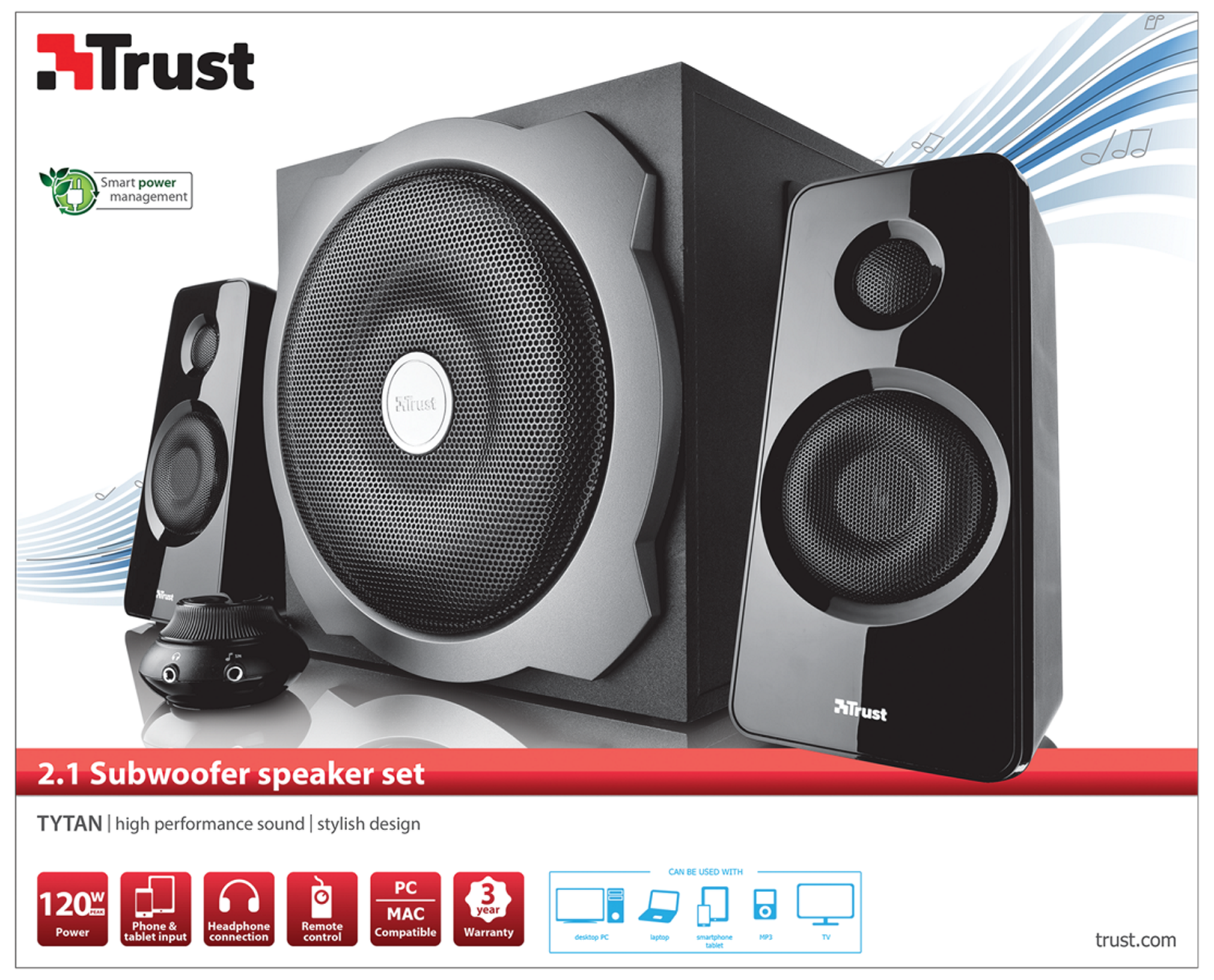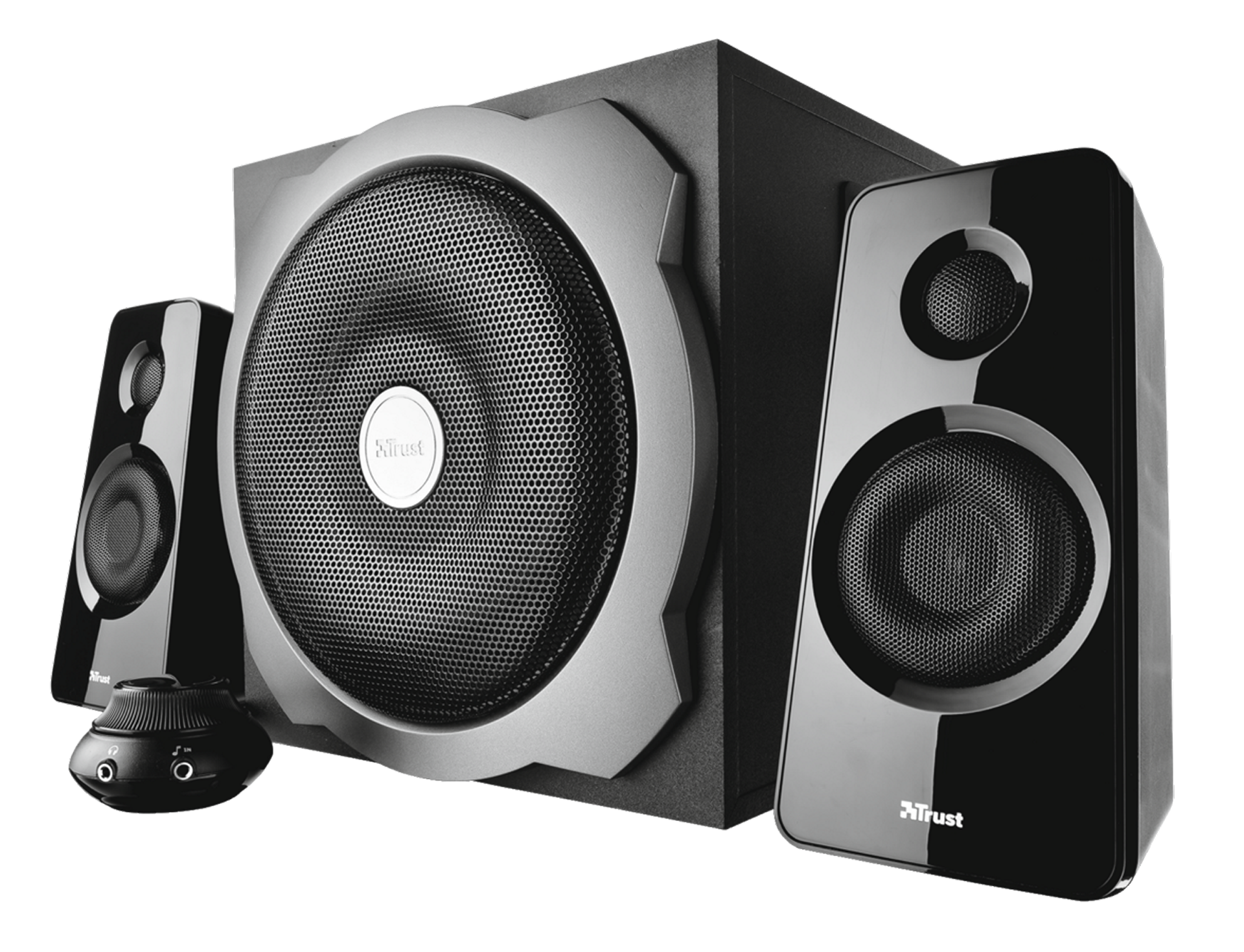 Sestava 2.1 reproduktorů s dřevěným subwooferem a úhrnným výkonem 60 W RMS (maximální výkon 120 wattů) * Sestava 2.1 reproduktorů s dřevěným subwooferem a úhrnným výkonem 60 W RMS (maximální výkon 120 wattů) * Vysoce kvalitní zvuk s hlubokým basem * Praktické drátové ovládání hlasitosti pro připojená sluchátka nebo přehrávač iPod/mp3 * Postranní ovládání hlasitosti a basů Rozměry a hmotnost * Rozměry subwoofer: 25 x 25 x 25 cm * Rozměry satelity: 20 x 10 x 10 cm * Hmotnost 4.9 kg Obsah balení: * Reproduktory s kabely * Subwoofer s napájecím kabelem * Dálkové ovládání s kabelem * Uživatelská příručka Systémové požadavky: * 3.5 mm audio konektor * Připojení do elektrické zásuvky Více na webu výrobce: http://www.trust.com/en/product/19019-tytan-2-1-subwoofer-speaker-set-black