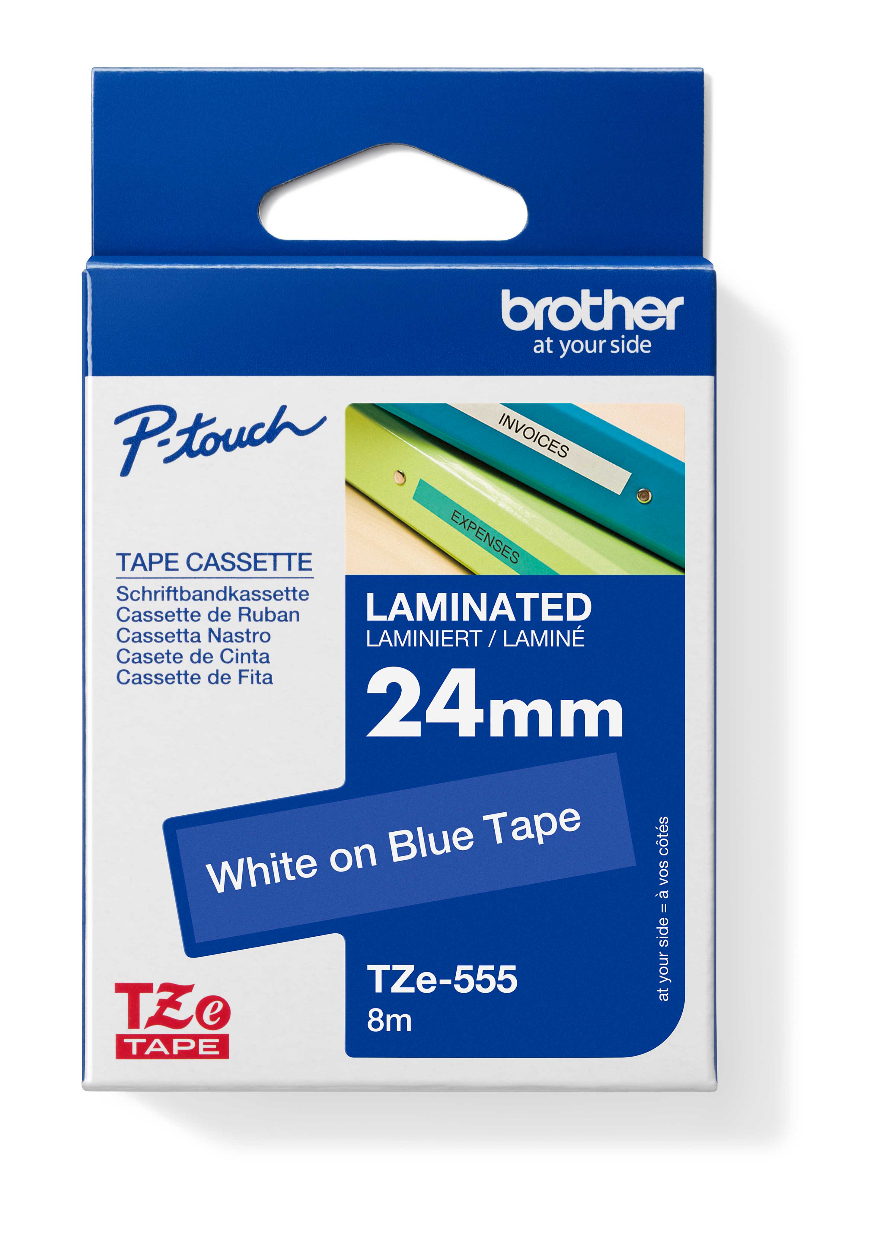 Originální kazeta s laminovanou páskou TZe-555 kompatibilní s širokou řadou tiskáren Brother P-touch je zvláště všestranná díky své snadno čitelné bílé a modré barvě - ideální pro domácnost, kancelář a další pracoviště.