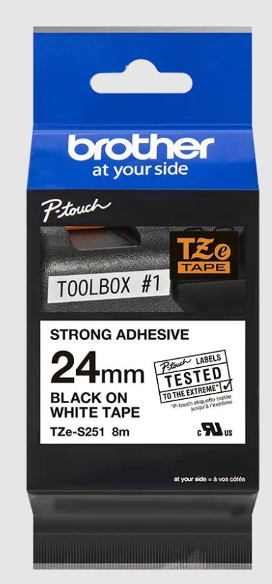 Originální páska Brother TZe-S251 s patentovanou laminovanou ochrannou vrstvou byla vyvinuta s důrazem na trvanlivost v extrémních podmínkách. Díky silnému lepidlu se vyznačuje extrémní přilnavostí a je ideální pro použití na zrnitých površích, jako jsou kovové skříně a strukturované plasty. Kompatibilní s tiskárnami štítků P-touch, které mají logo TZ nebo TZe na krytu kazety s páskou.
