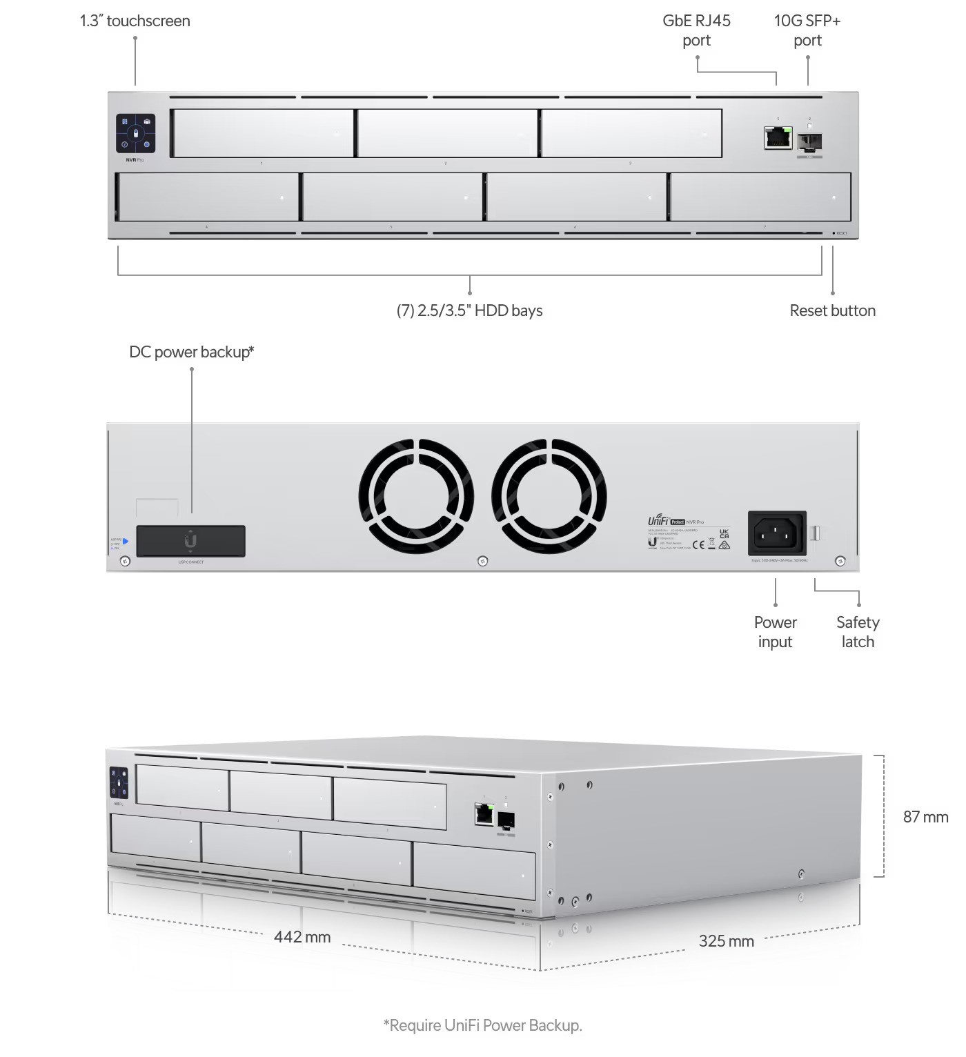 NVR má výkon pro nahrávání až 60 kamer ve Full HD rozlišení nebo 20 kamer ve 4K rozlišení a uchováním záznamu po dobu 60 dnů. NVR podporuje až 7 diskových pozic pro SSD/HDD s maximální kapacitou 16TB/disk, podporuje RAID 1/5/10 pro vyšší spolehlivost uchování dat, má 3" dotykový displej, který s pozdější verzí bude umožňovat i náhled videa, Gigabit LAN port, SFP+ port s podporou rychlostí 1G/10Gbps a redundantní napájení pomocí UniFi SmartPower (USP-RPS).