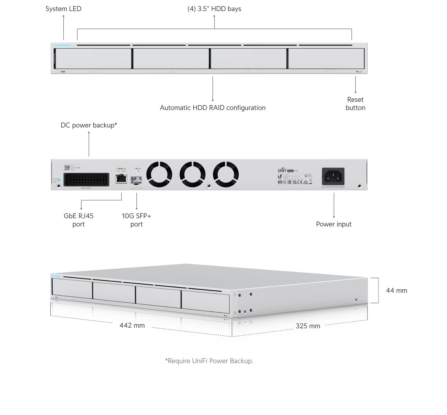 UniFi NVR je Enterprise zařízení, na kterém je předinstalovaný software UniFi Protect a je vybaveno 4 šachtami, do kterých lze umístit jak 2,5" tak 3,5" disky.